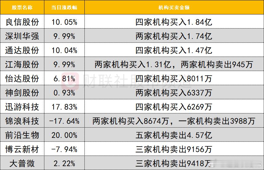 今日龙虎榜机构活跃度较高,华为算力概念股深圳华强走出4天3板,获两家机构买入1.74亿。江海股份强势涨停,获两家机构买入1.31亿,同时深股通买入0.49亿。前沿生物遭五家机构大幅卖出4.57亿。