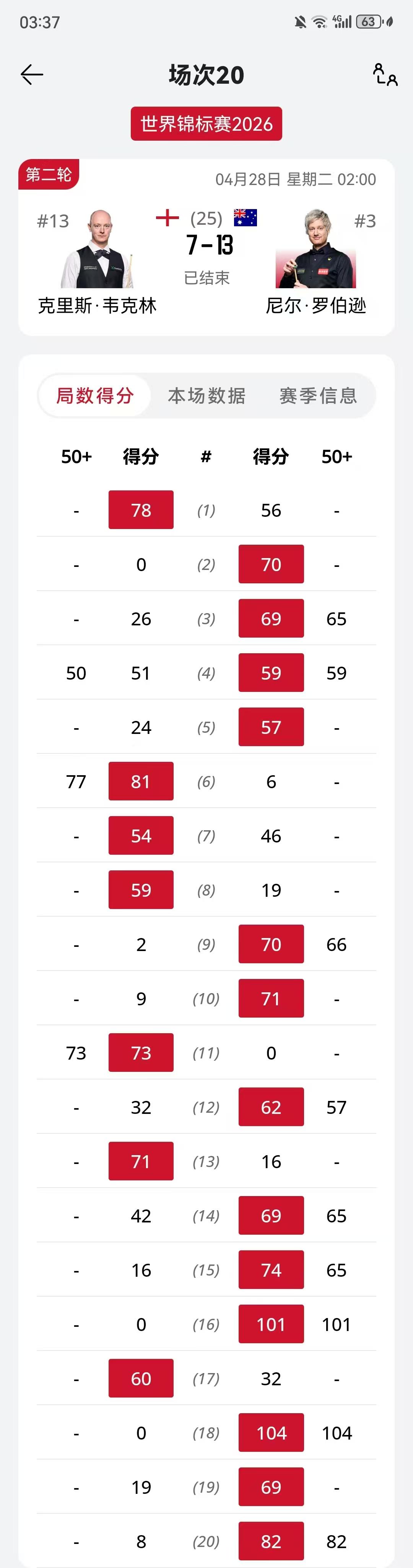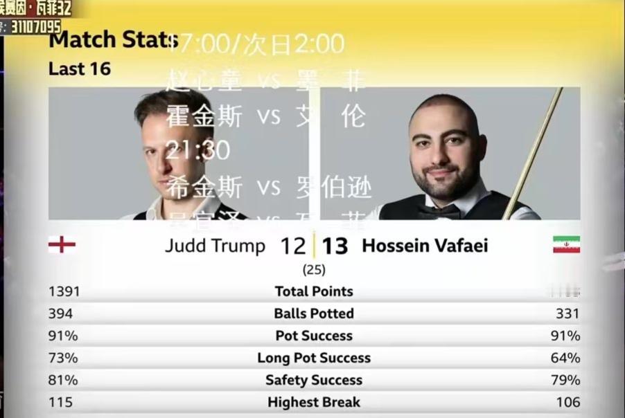 晚上9点30分,吴宜泽对阵瓦菲