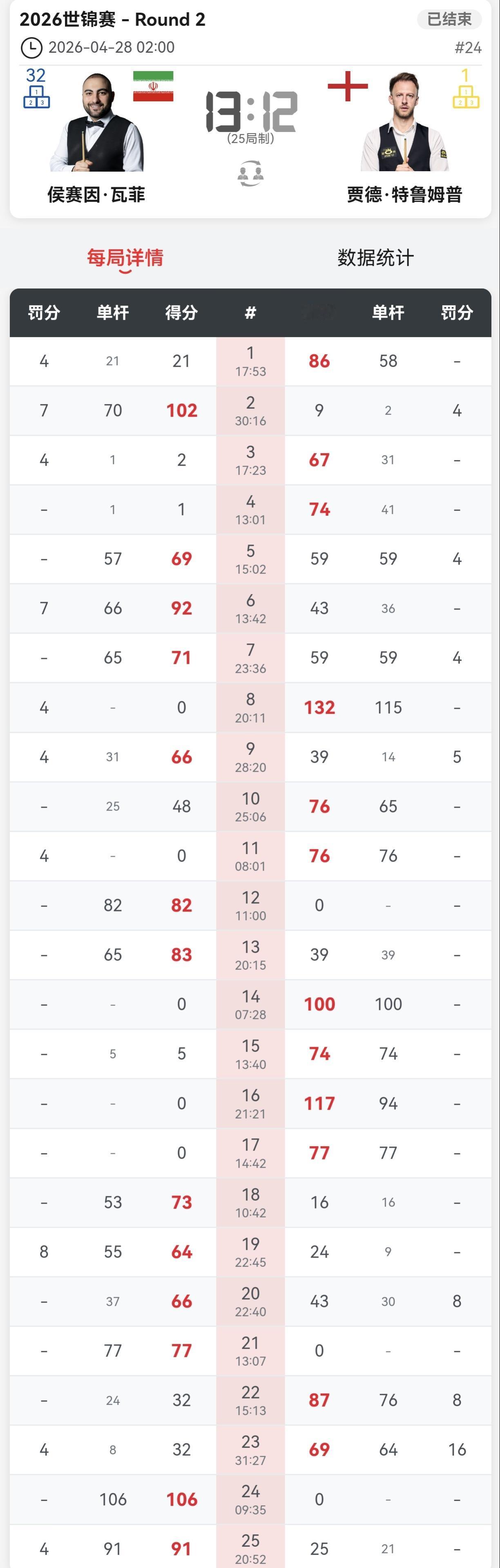 变天了,世界第一特鲁姆普被瓦菲淘汰。 特鲁姆普一度10-7领先,马上就快胜利。