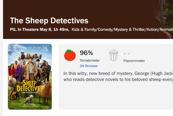 由凯尔·巴尔达执导的悬疑喜剧《绵羊侦探团》烂番茄已经开分,暂时96%新鲜度。