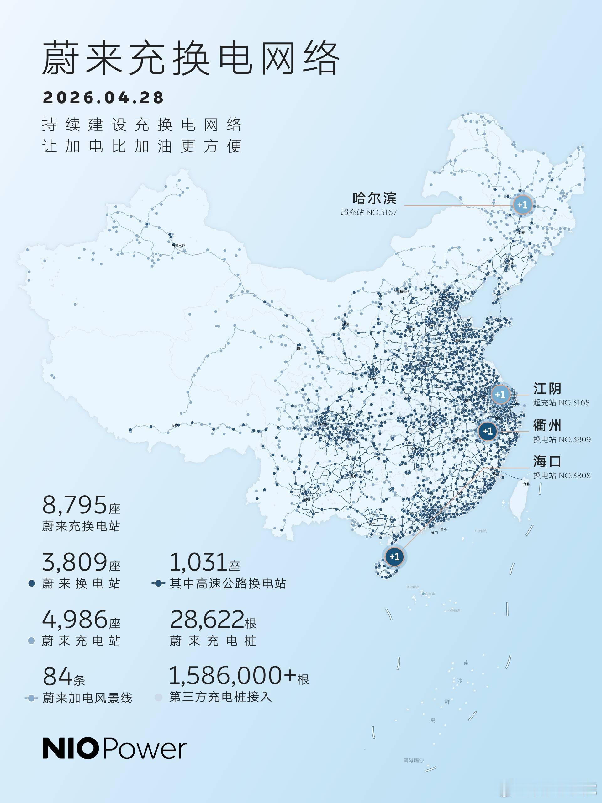 4月28日,NIO Power 4站上线NO.3808 蔚来换电站 | 海口金巷路NO.3809 蔚来换电站 | 衢州258创新创业园NO.3167 蔚来超充站 | 哈尔滨延寿金街NO.3168 蔚来超充站 | 江阴新桥雍景园持续布局-让加电比加油更方便