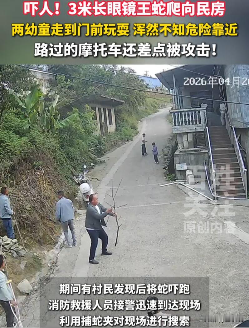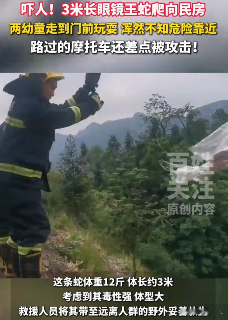 贵州黔西南,一条三米多长的眼镜王蛇从草丛里爬出来,朝民房方向去。楼上两个小孩在玩,没看见。一男子骑摩托经过,蛇被惊动,直起身要攻击。男子报警,消防找到蛇,放归山野