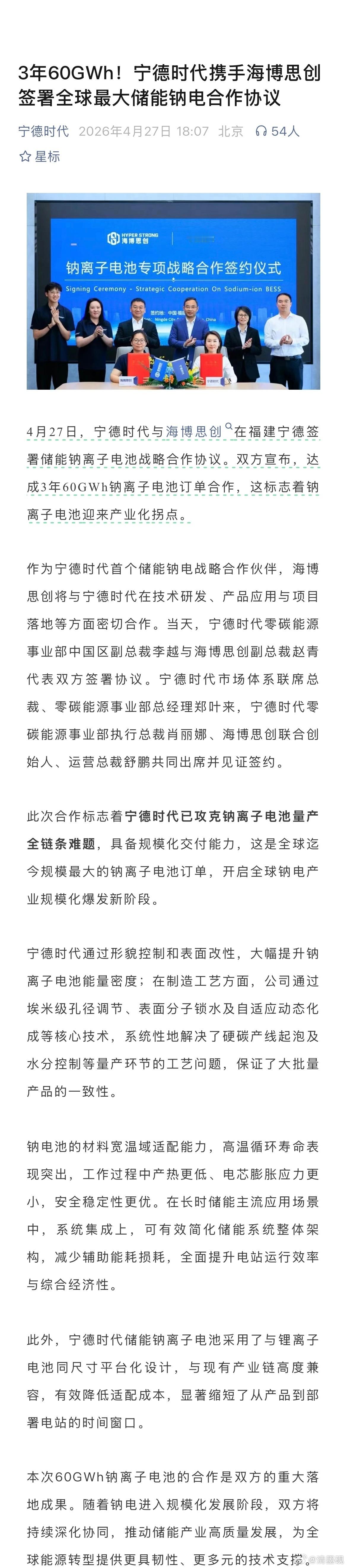 宁德时代获全球规模最大的钠电池订单!我发现海博思创这家上市公司很牛逼啊,去年十一月份签订了一个三年200GWh的协议,这又是一个三年60GWh的协议!具体看图!可以估算海博思创的电芯一项,按照每瓦时3毛计算,年采购的就要达到100-200亿元!海博思创2025年前三季度营收多少呢??79亿元!这是业务要翻倍才能达到的,估计科创板增速快吧!宁德时代的体量真的是上下游的超级采购商和供应商,他真的能左右行业的发展和企业的好坏!宁德时代