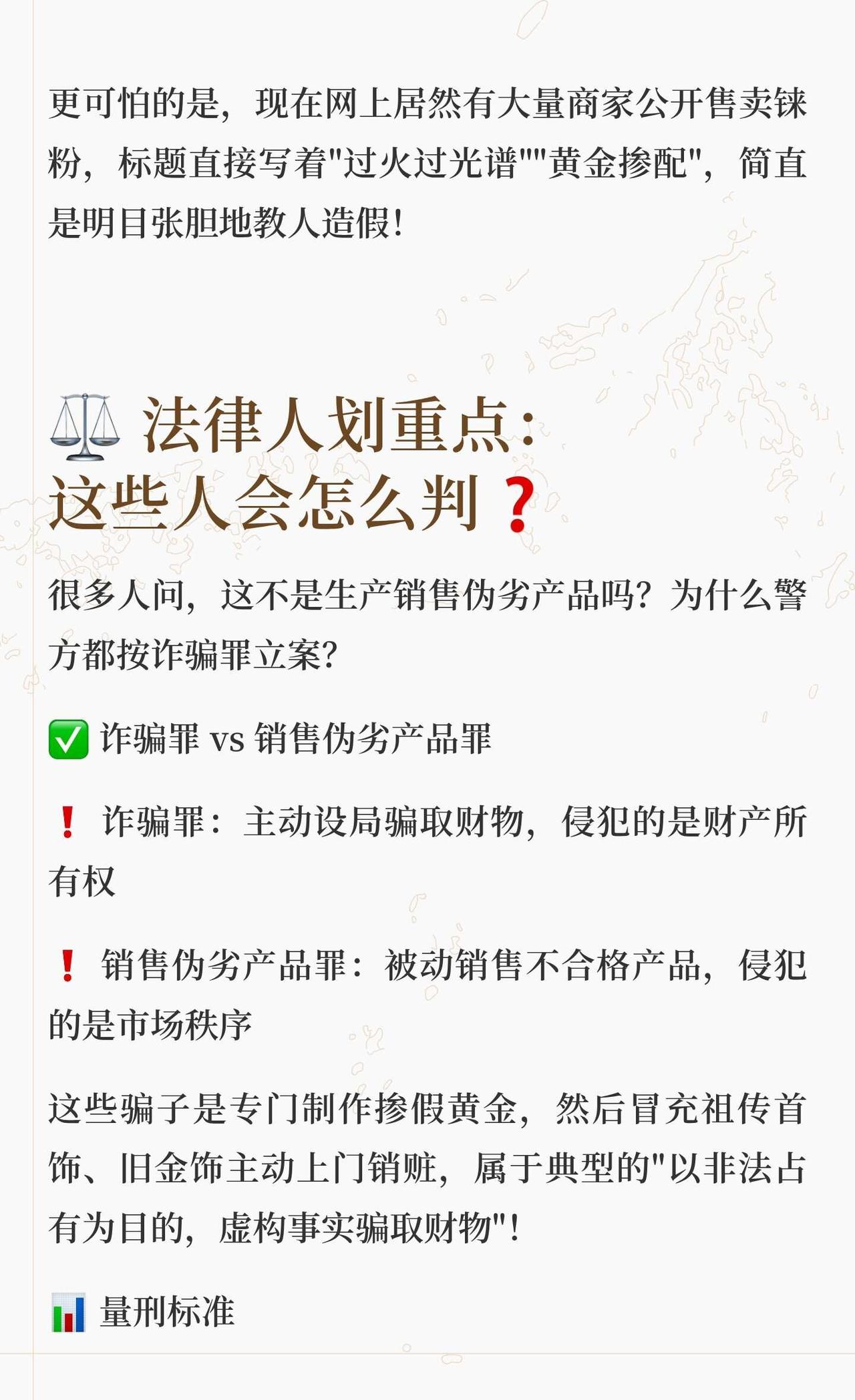 央视曝光黄金造假骗局,不法分子在黄金中掺入铼粉,肉眼和仪器难以检测,导致金店损失数百万。警方按诈骗罪立案,涉案者面临严厉刑罚。提醒消费者购买黄金时索要国检证书,保留凭证,避免贪便宜,发现被骗立即报警。普法宣传 真实案件 法律维护社会公平正义 热点新闻事件 知行悦读者 坚决打击犯罪 法律的力量 律界普法君 提高防骗意识