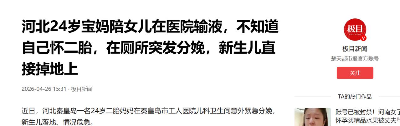 (信息来源:《自己都不知道怀孕了,24岁宝妈在医院厕所生了二胎,从没进行过正规孕检,医护人员破门救人母子平安》都市现场)