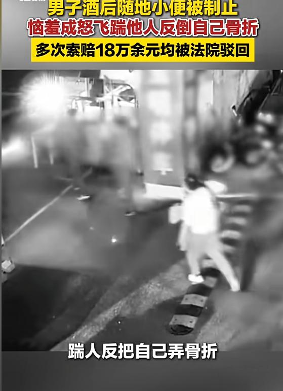 “自作自受!”4月27日报道,北京,一男子在停车场小便,管理员看见后上前制止,男子越想越气,趁管理员转身离开时,飞起一脚踹向对方,不料踹空摔倒,落了个粉碎性骨折,事后男子竟还起诉停车场,索赔18万!网友:哪来的脸!