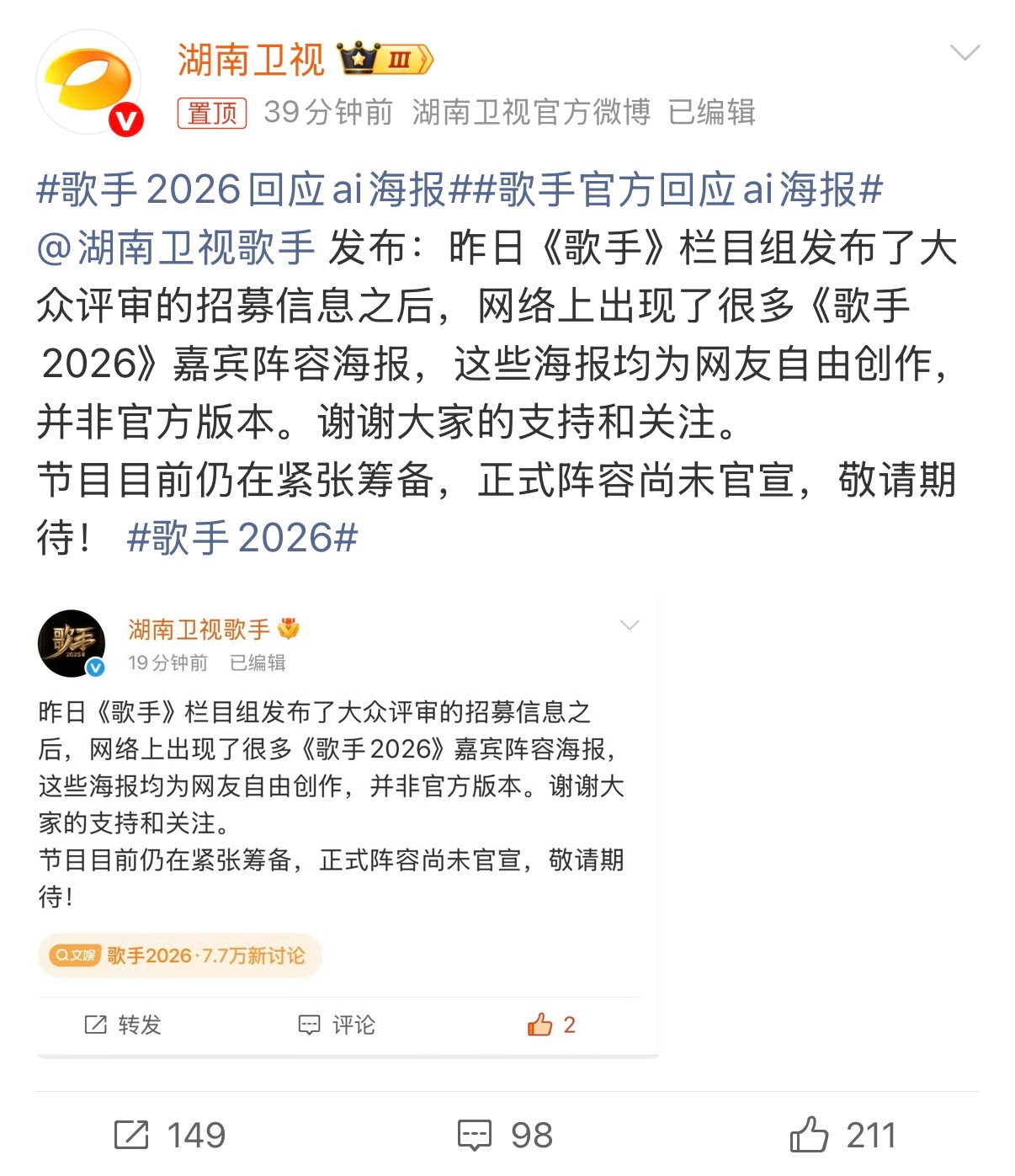 歌手2026回应ai海报歌手官方回应ai海报 感谢大家热情期待,网传嘉宾海报均为网友创作,官方消息请锁定官方账号~