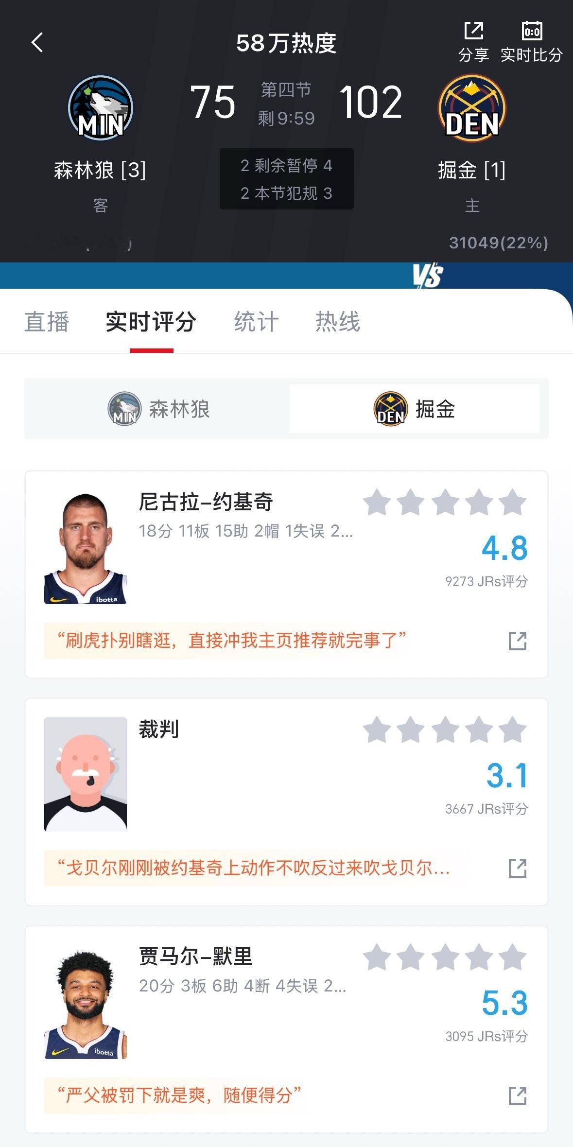掘金领先森林狼这么多 看看约基奇和穆雷的评分 虎扑被霸占多年 现在直播吧也被霸占