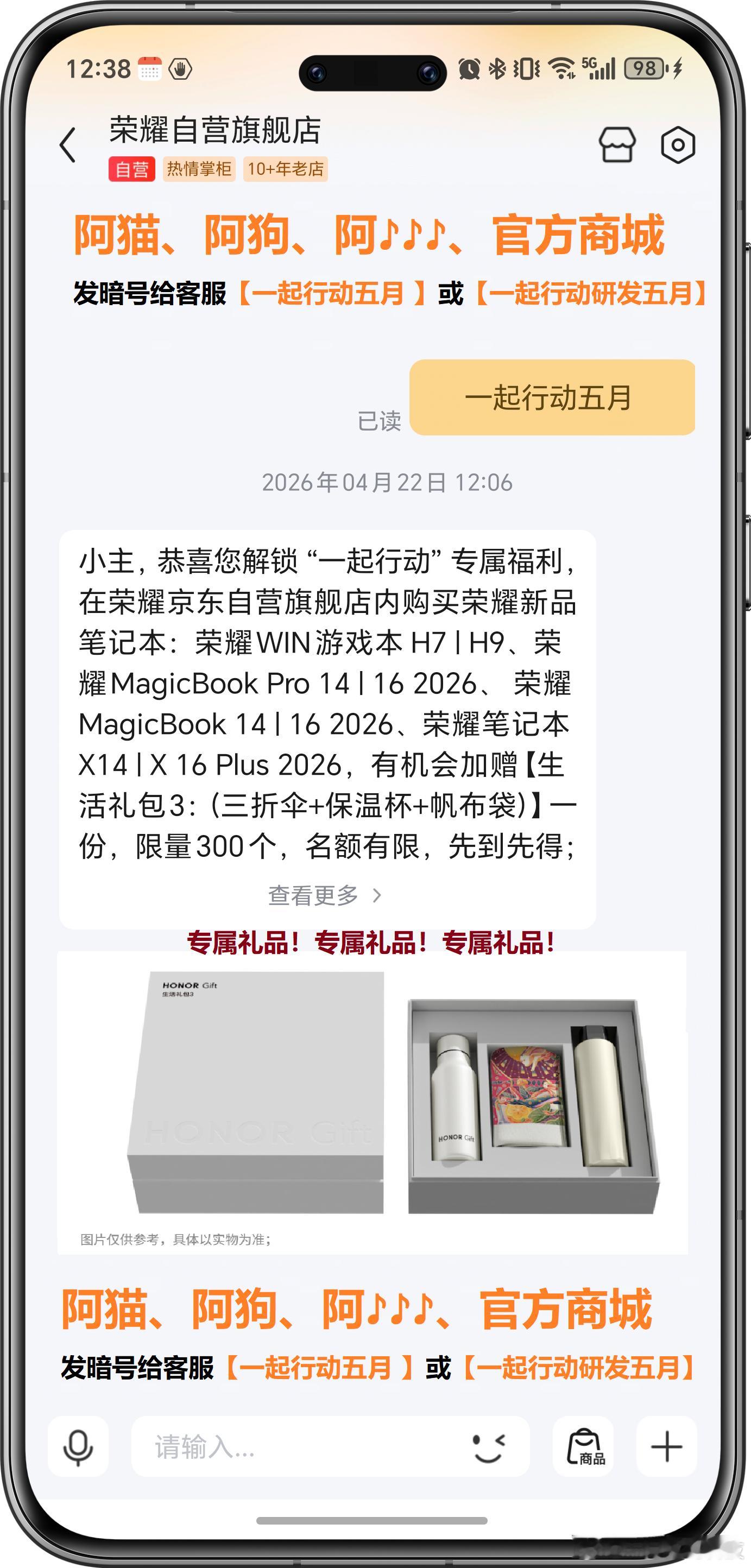 在阿猫、阿狗、某音、官方,GO后向人工发暗号,专属礼品包含保温杯+雨伞+帆布袋,暗号:【一起行动五月】或【一起行动研发五月】【一起行动五月】或【一起行动研发五月】【一起行动五月】或【一起行动研发五月】