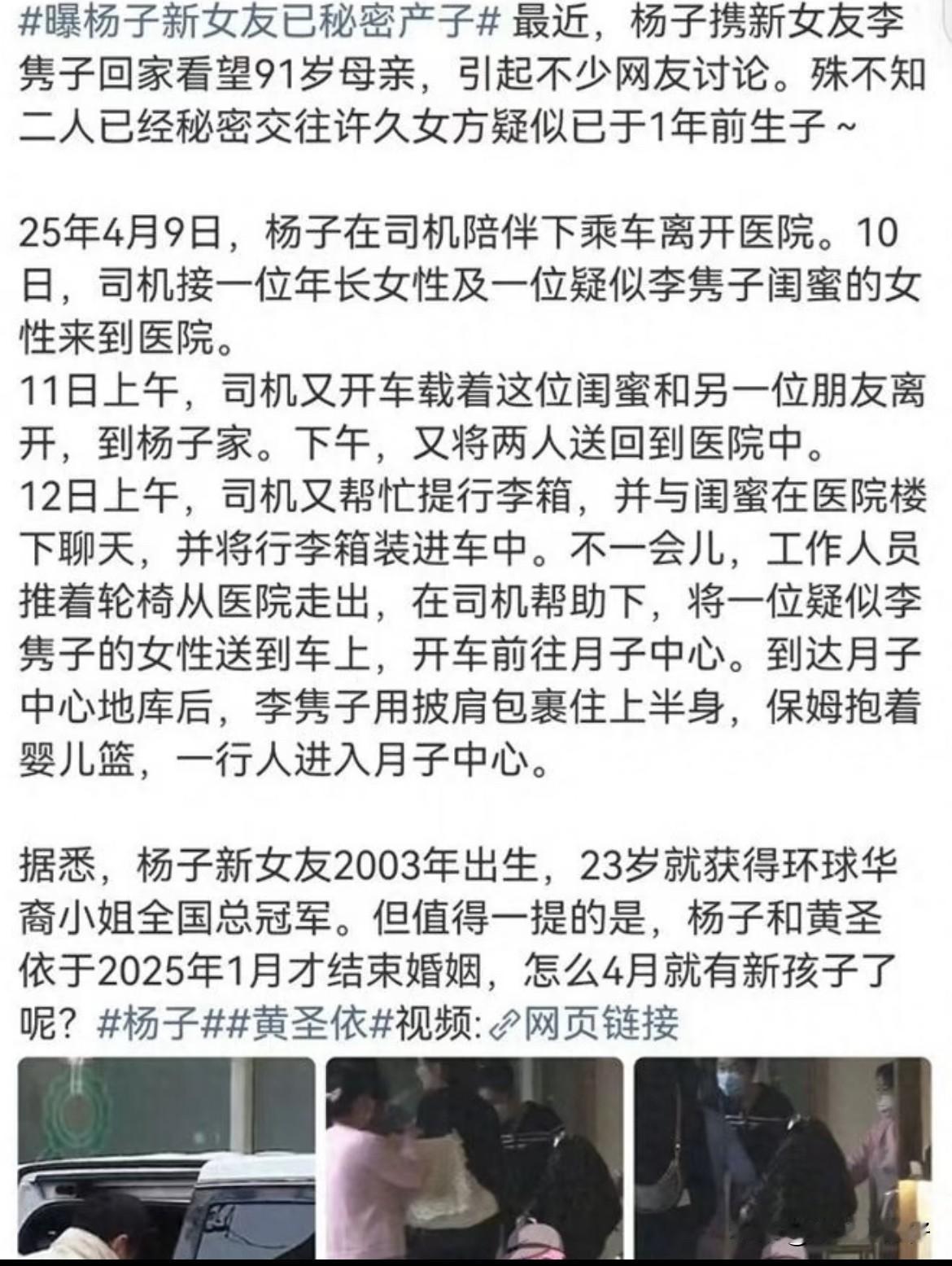 黄圣依真是忍者。 她和杨子2025年1月离婚,4月杨子的新女友就在医院产子。俩人