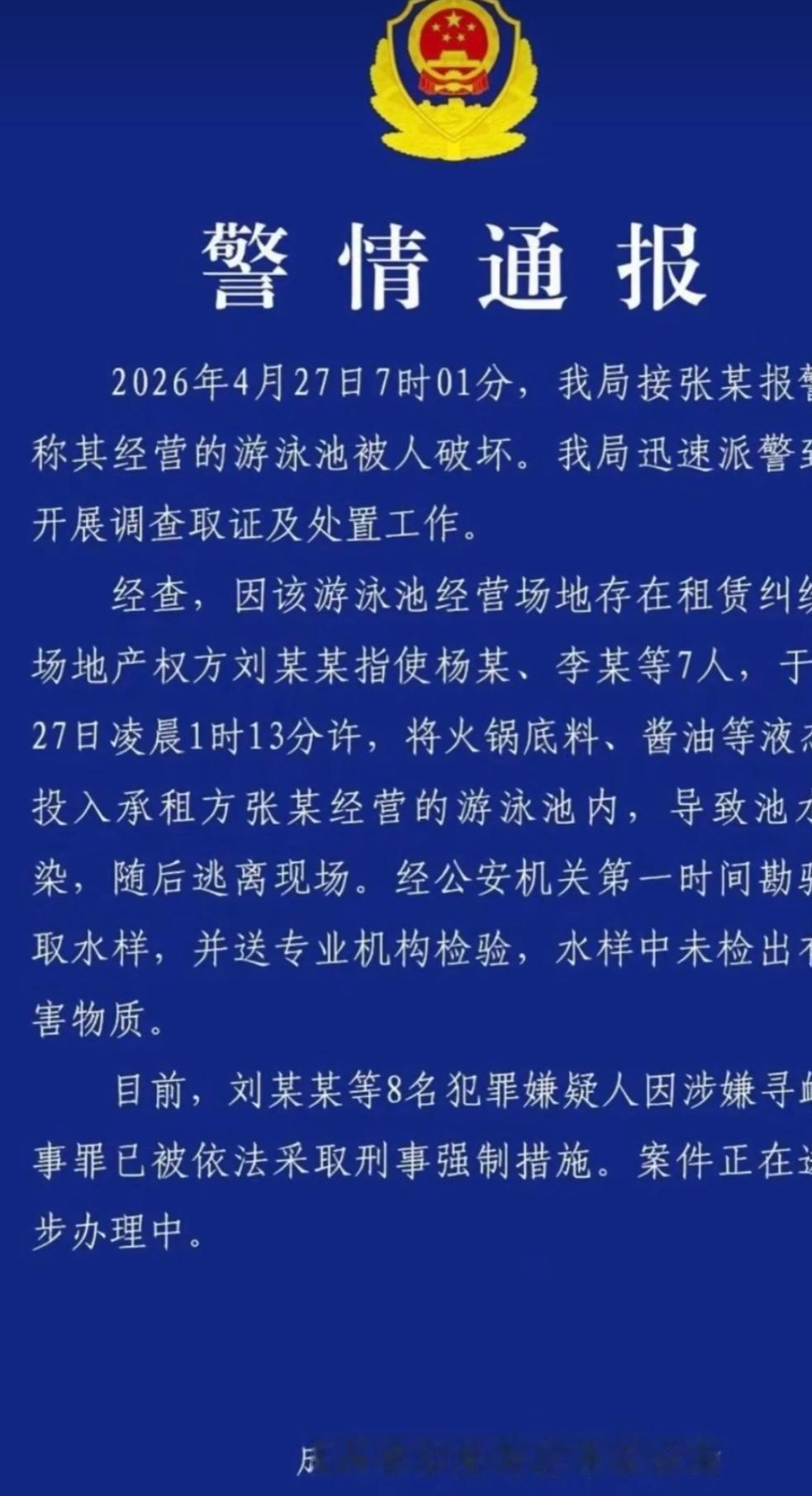 四川成都,一男子租场地开了一家游泳馆,因为租赁合同和场地方存在一些纠纷,男子以为慢慢沟通总有解决方法,结果没有想到,场地方负责人居然找了7个混混往游泳池里倒入酱油,火锅底料等,造成池水污染,虽然干了坏事后逃走,但是逃不过法律的制裁,如今场地方负责人和7个作案者被刑事强制措施。