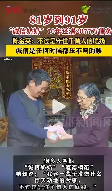 有人说她太傻,一把年纪何必遭这份罪;可更多人,被她骨子里的诚信狠狠打动。在这个很多人欠钱不还、失信跑路的时代,这位耄耋老人,用十年坚守,诠释了什么是一诺千金,什么是人间正气。