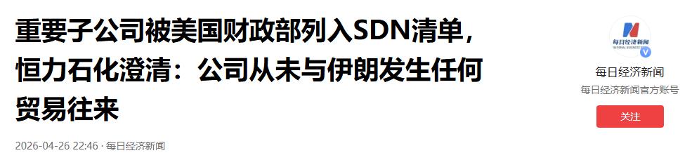信息来源:重要子公司被美国财政部列入SDN清单,恒力石化澄清:公司从未与伊朗发生任何贸易往来 2026-04-26 22:46·每日经济新闻
