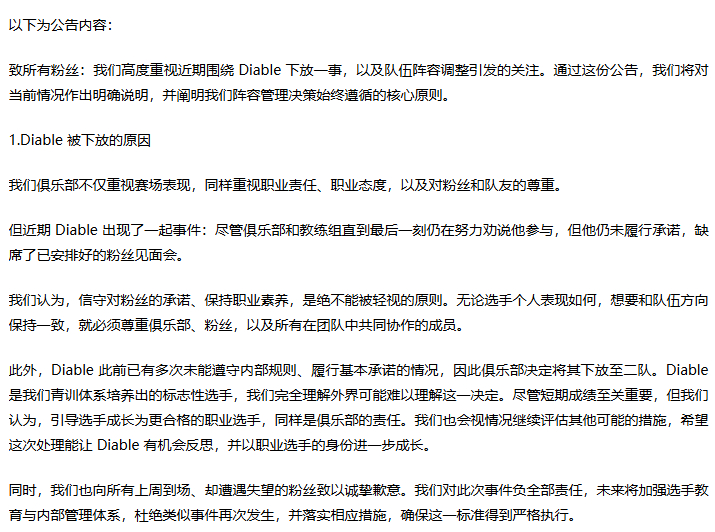 BFX回应下放DiableDiable被下放二队BFX二队的比赛出战名单中,出现了原本在一队被视为核心的下路选手Diable,随后官方在推特上做出了相应解释,称Diable多次出现未遵守内部规则、未履行基本承诺的情况。简单给大家总结一下,Diable未能如约参加粉丝见面会,不服从战队安排