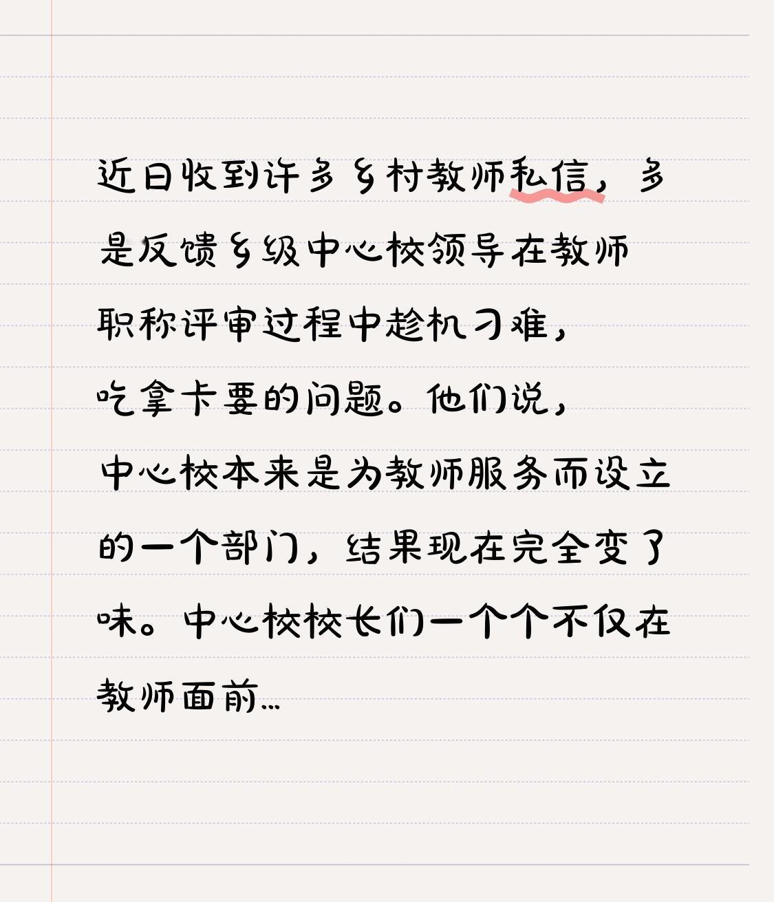 近日笔者收到许多乡村教师私信,多是反馈乡级中心校领导在教师职称评审过程中趁机刁难,吃拿卡要的问题。