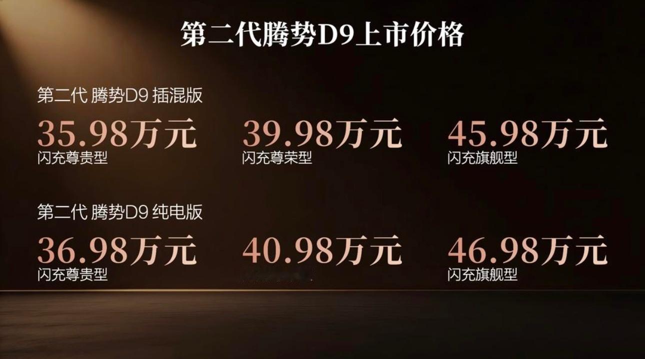 4月27日,比亚迪第二代腾势D9正式上市,新车共推出6款车型,包含3款插混版本与3款纯电版本。其中插混车型CLTC纯电续航401km,纯电车型CLTC续航800km,官方指导价35.98万元—46.98万元。详细看了一下,第二代腾势D9为进一步满足用户豪华出行需求,在外观、内饰、空间三大维度进行了全面优化升级,同时还在核心配置上完成九大迭代升级。搭载比亚迪第二代刀片电池、闪充技术、全球首创「合元」超集成动力平台、天神之眼5.0辅助驾驶系统、双阀云辇-C等高端硬核配置,全面进阶产品力,重新塑造豪华出行的新追求!