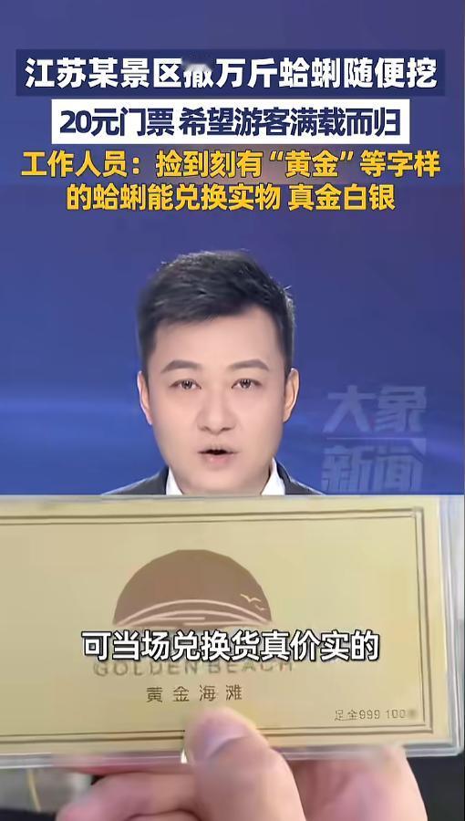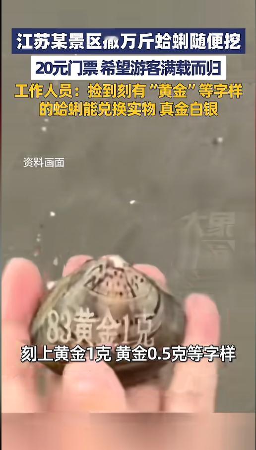 信息来源:《4月27日报道,江苏某景区撒万斤蛤蜊随便挖,20元门票,希望游客满载而归,工作人员:捡到刻有“黄金”等字样的蛤蜊,能兑换实物真金白银》大象新闻