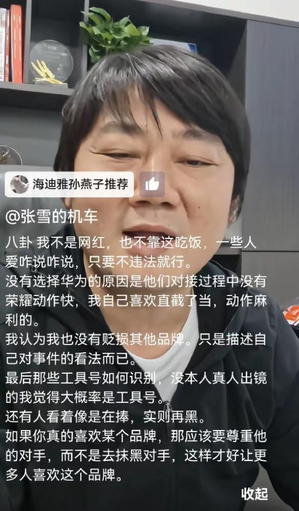 张雪这波回应,直接打懵所有质疑者!不装腔作势,不扭扭捏捏。敢说敢做,硬气到骨子里!事情很简单。余承东发布会前被拍,助理递水被恶意解读。断章取义扣上“耍大牌”的帽子,全网群嘲。别人都避之不及,张雪偏要站出来。直言看不惯,力挺余承东很男人。说他只是赛前般高度专注,不该被抹黑。这话一出,争议炸了。有人骂他蹭热度,有人说他想抱华为大腿。面对质疑,张雪直接放出王炸。公开回应:我拒绝了半个亿的商务合作!其中,就包括华为的合作邀约。他反问:我需要抱大腿吗?这话,够硬气,够底气!现在的网络,太离谱。有人靠断章取义博流量,有人靠抹黑他人找存在感。一堆“工具号”伪装成粉丝,故意挑事引骂战。就为了一点热度,连中国品牌都敢抹黑。张雪看得明白,也敢说真话。他不是网红,不靠流量吃饭。拒绝半个亿,守住的是底线,是本心。力挺余承东,不是站队,是看不惯恶意抹黑。比起那些见利忘义、趋炎附势的人。张雪这种“知世故而不世故”的真性情,太难得!他说自己几十年都这样,从不需要打造人设。这份坦荡,甩了多少伪君子几条街?其实我们缺的,就是这样的硬气。不被资本裹挟,不被舆论绑架。敢说真话,敢守底线,敢做自己。张雪拒绝半个亿,力挺余承东,从来不是作秀。是成年人最难得的清醒,是骨子里的耿直与底气。对于张雪回应力挺余承东、拒绝半个亿商务合作这事儿,你们站他吗?张雪回应力挺余承东 华为 张雪称拒绝了半个亿的商务合作 张雪