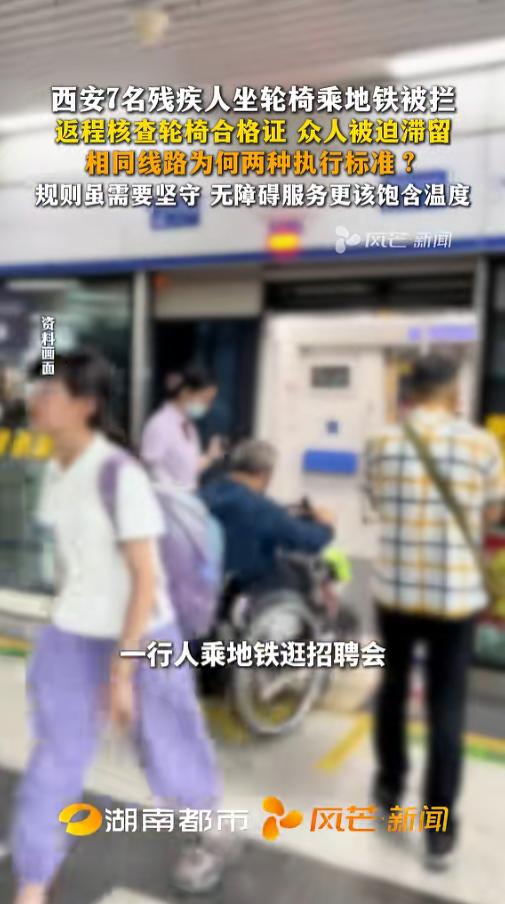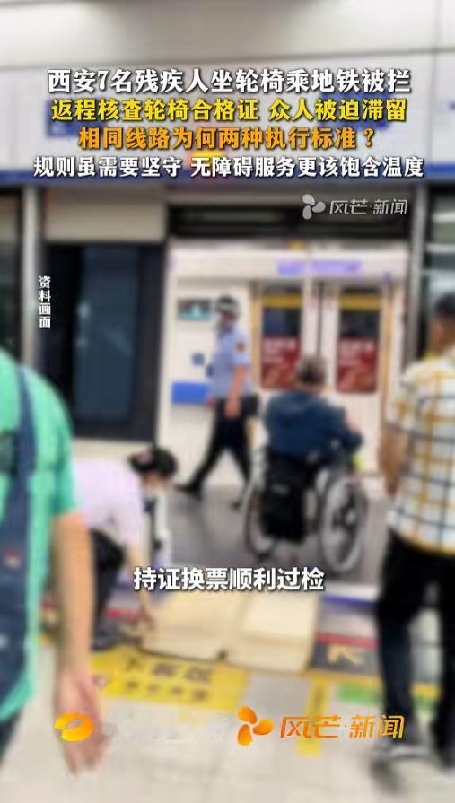 信息来源:《西安7名残疾人坐轮椅乘地铁被拦 返程核查轮椅合格证 众人被迫滞留 相同线路为何两种执行标准?规则虽需要坚守 无障碍服务更该饱含温度》风芒新闻