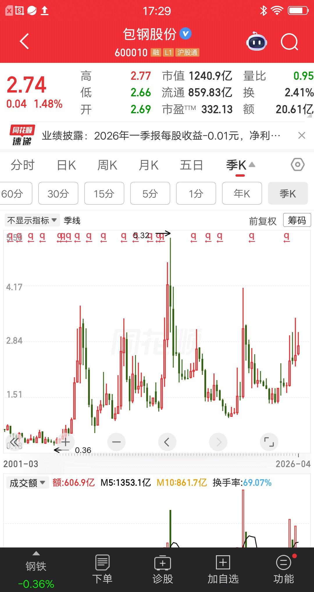 一位上海的股民,看到包钢股份的一季报,心态彻底绷不住了。净利润亏了4.627亿,同比骤降11倍多。他全仓包钢股份被套了,该怎么做才能回本,有没有大佬支支招。