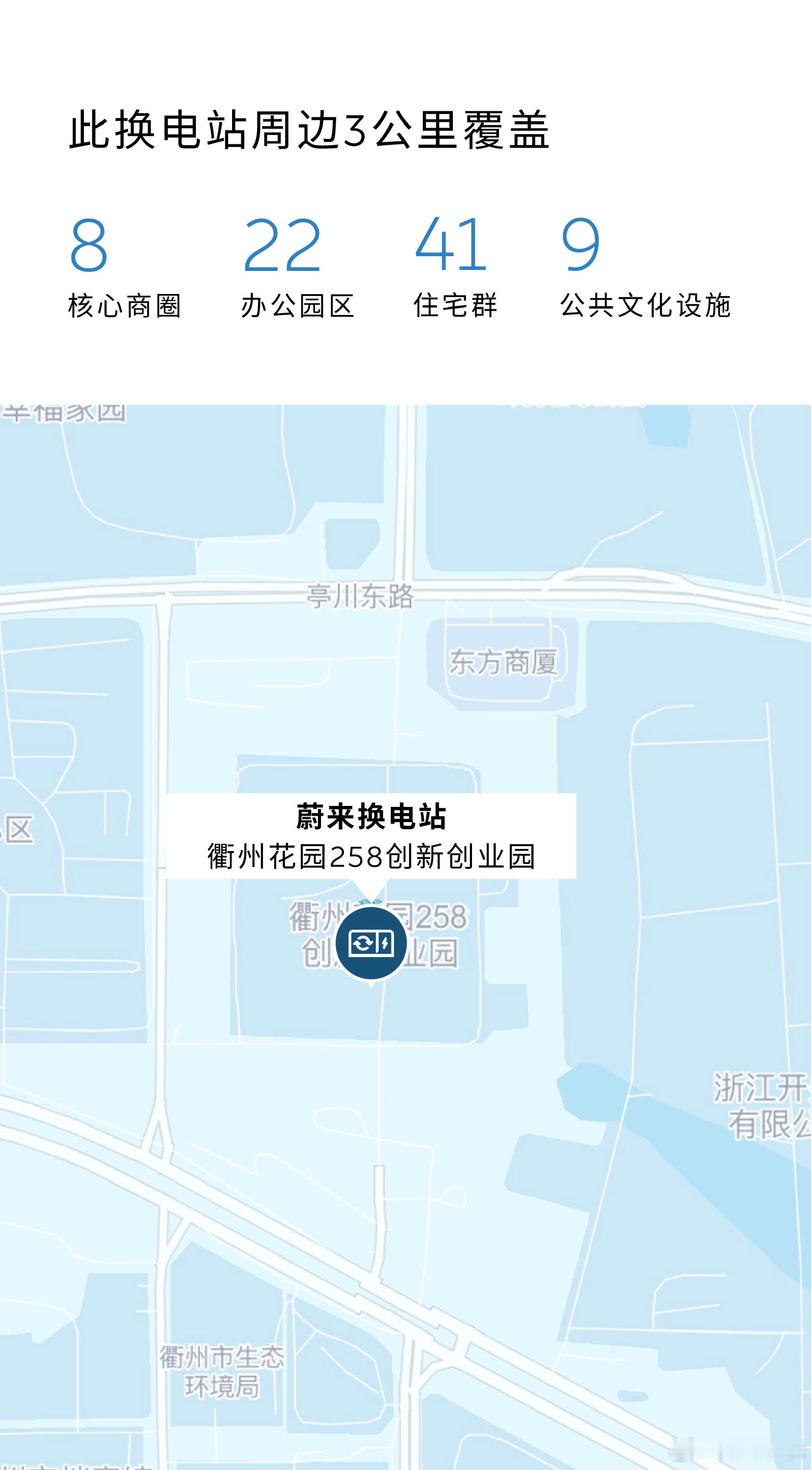 蔚来换电站 | 衢州花园258创新创业园 上线周边3公里覆盖8大核心商圈、22大办公园区、41大住宅群、9大公共文化设施截至4月28日,蔚来已在浙江省布局479座换电站,在全国布局3809座换电站蔚来换电去哪都方便