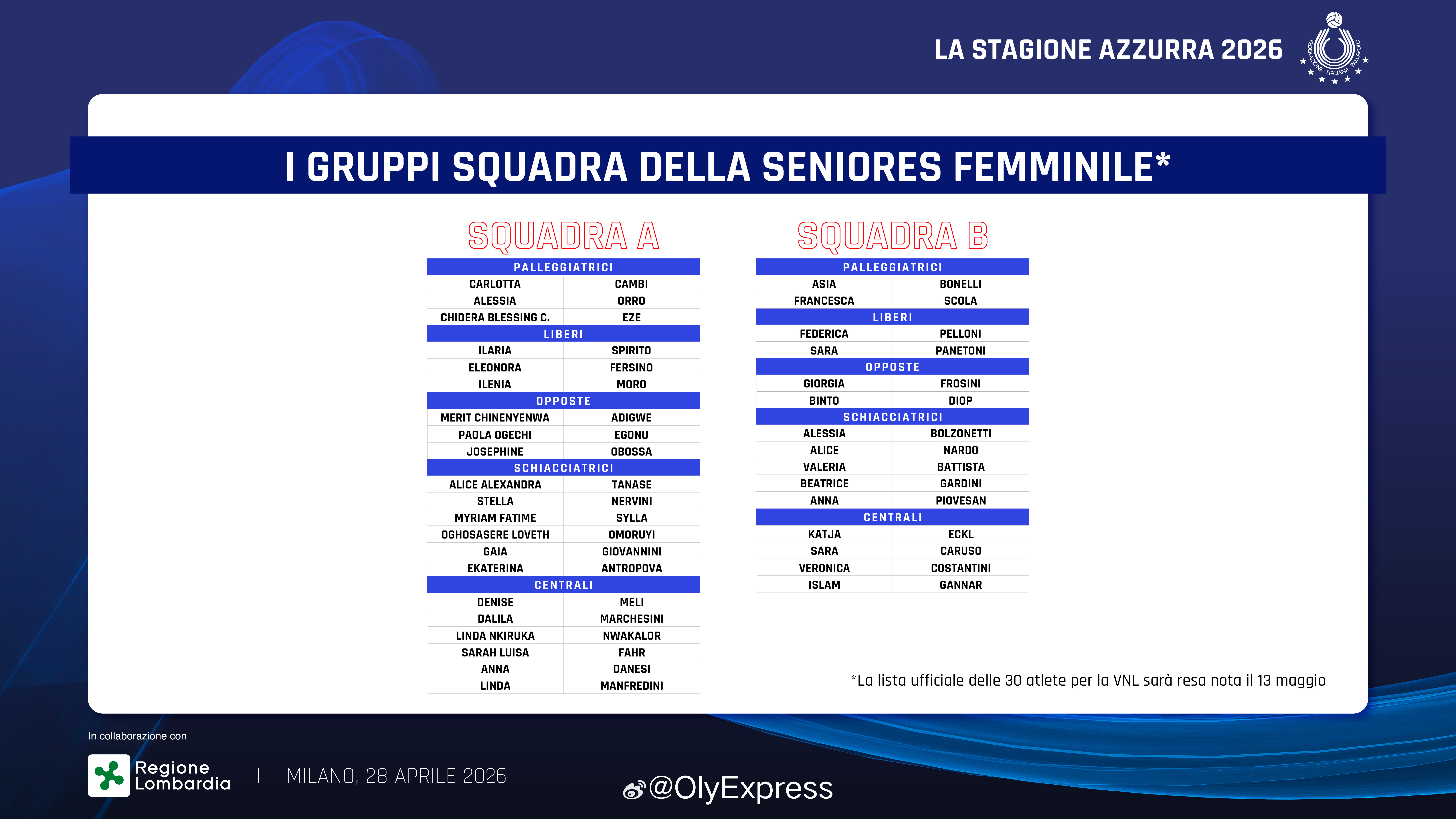 【意大利女排大名单】国际排坛动态 4月28日,意大利女排主教练贝拉斯科公布了国家队A队和B队名单,国家联赛30人名单将于5月13日公布。A队:二传:奥罗、坎比、埃泽接应:埃格努、奥博萨、阿迪维主攻:安特罗波娃、希拉、奥莫鲁伊、乔瓦尼尼、塔纳塞、内尔维尼副攻:恩瓦卡勒、法尔、达内西、曼弗雷迪尼、梅利、马切西尼自由人:斯皮里托、费尔西诺、莫罗B队:二传:博内利、斯科拉接应:弗罗西尼、迪乌普主攻:波佐內蒂、纳多、巴蒂斯塔、加尔迪尼、皮奥维桑副攻:埃克尔、卡鲁索、科斯坦蒂尼、甘纳尔自由人:佩洛尼、帕内托尼