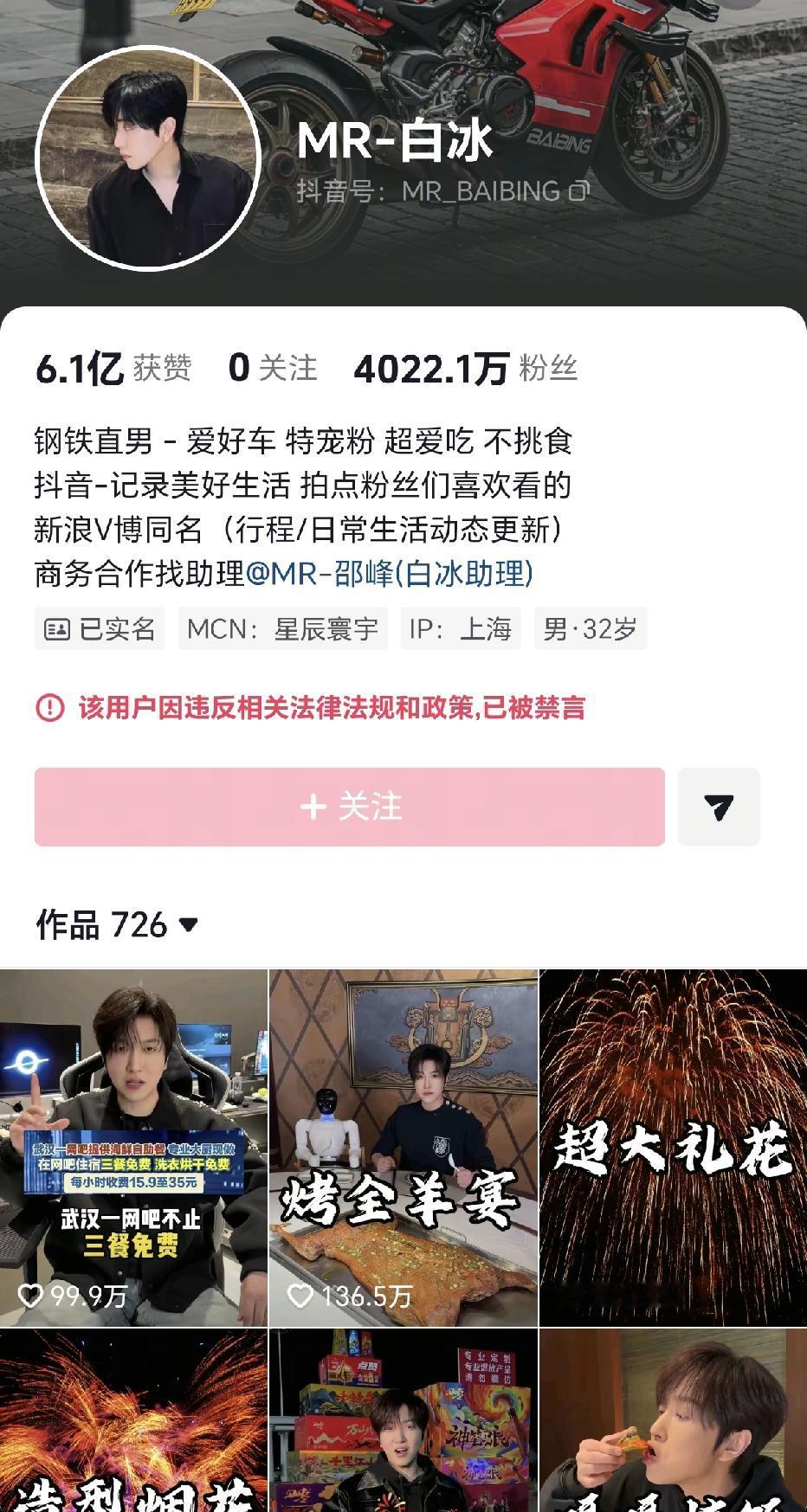 现在,他账号出现了掉粉的现象,官方也对其进行了处罚:该用户因违反相关法律法规和政策,已被禁言。