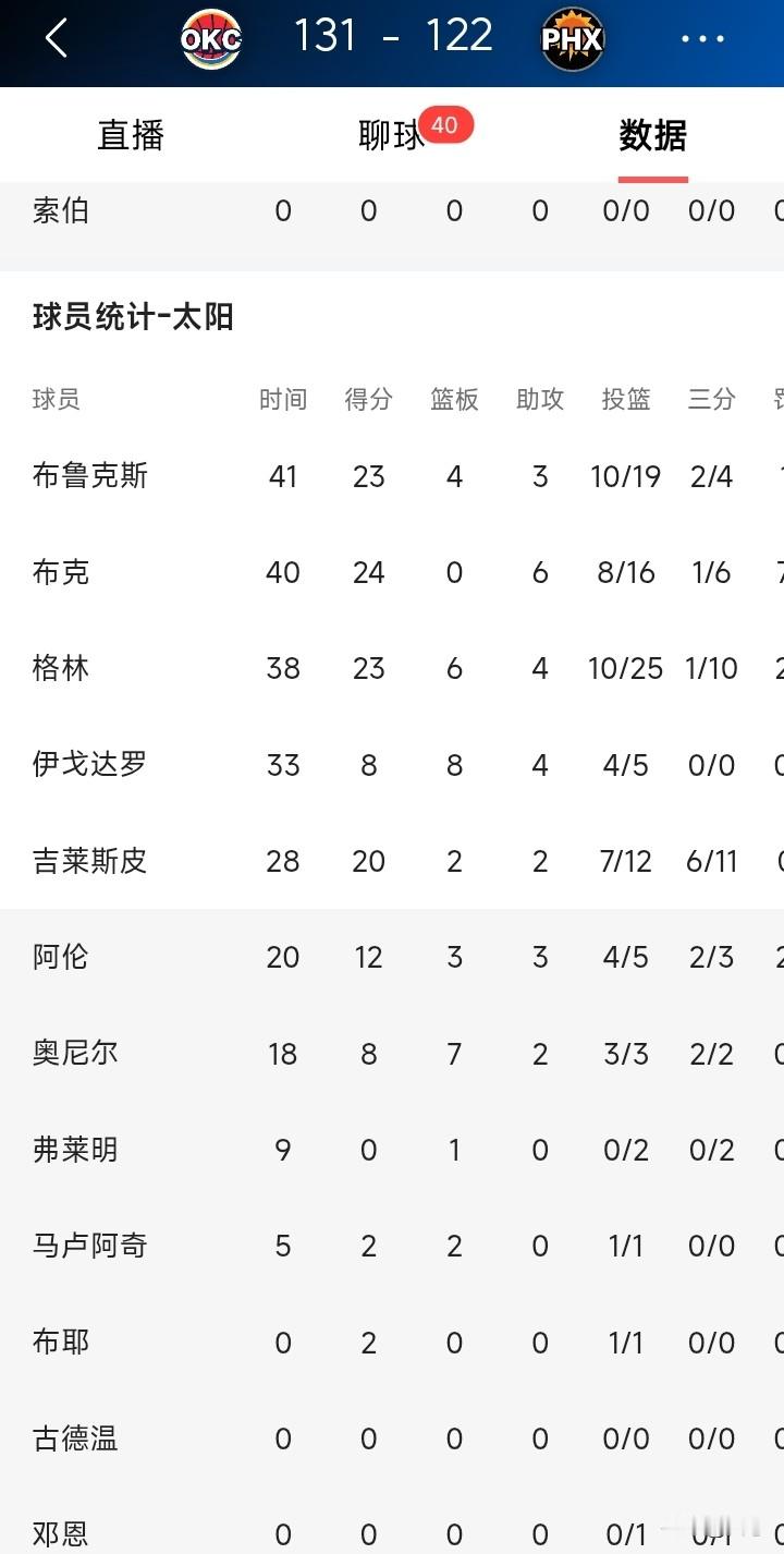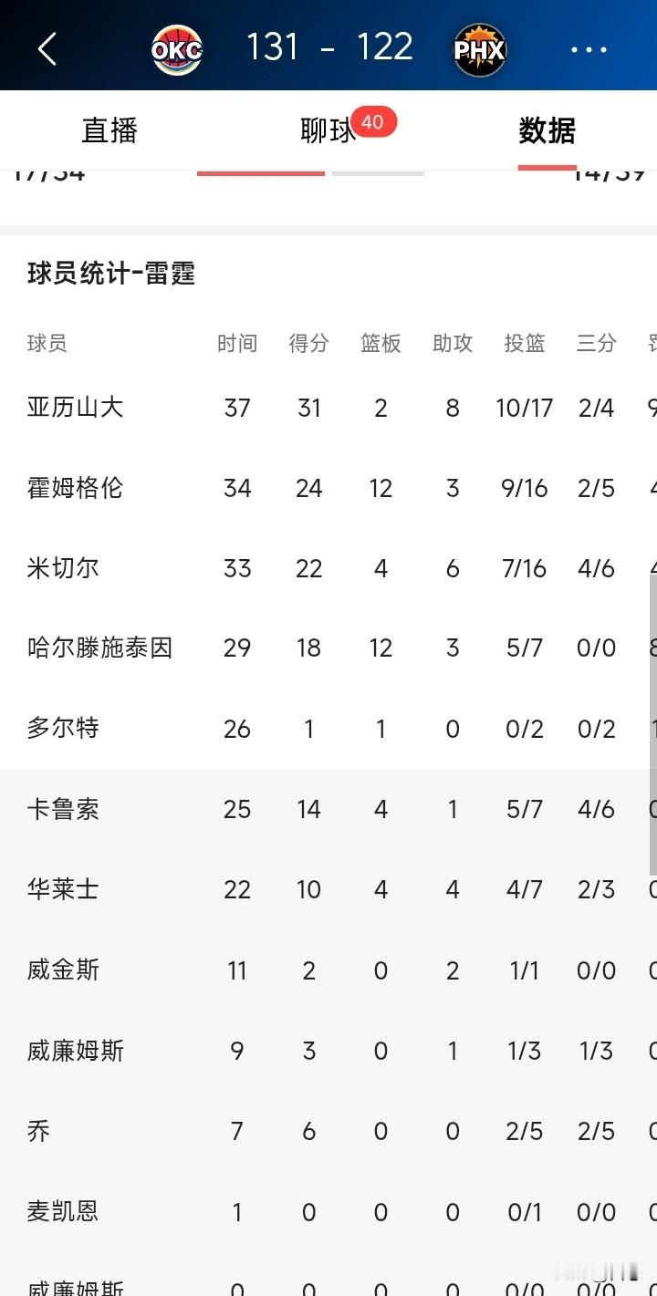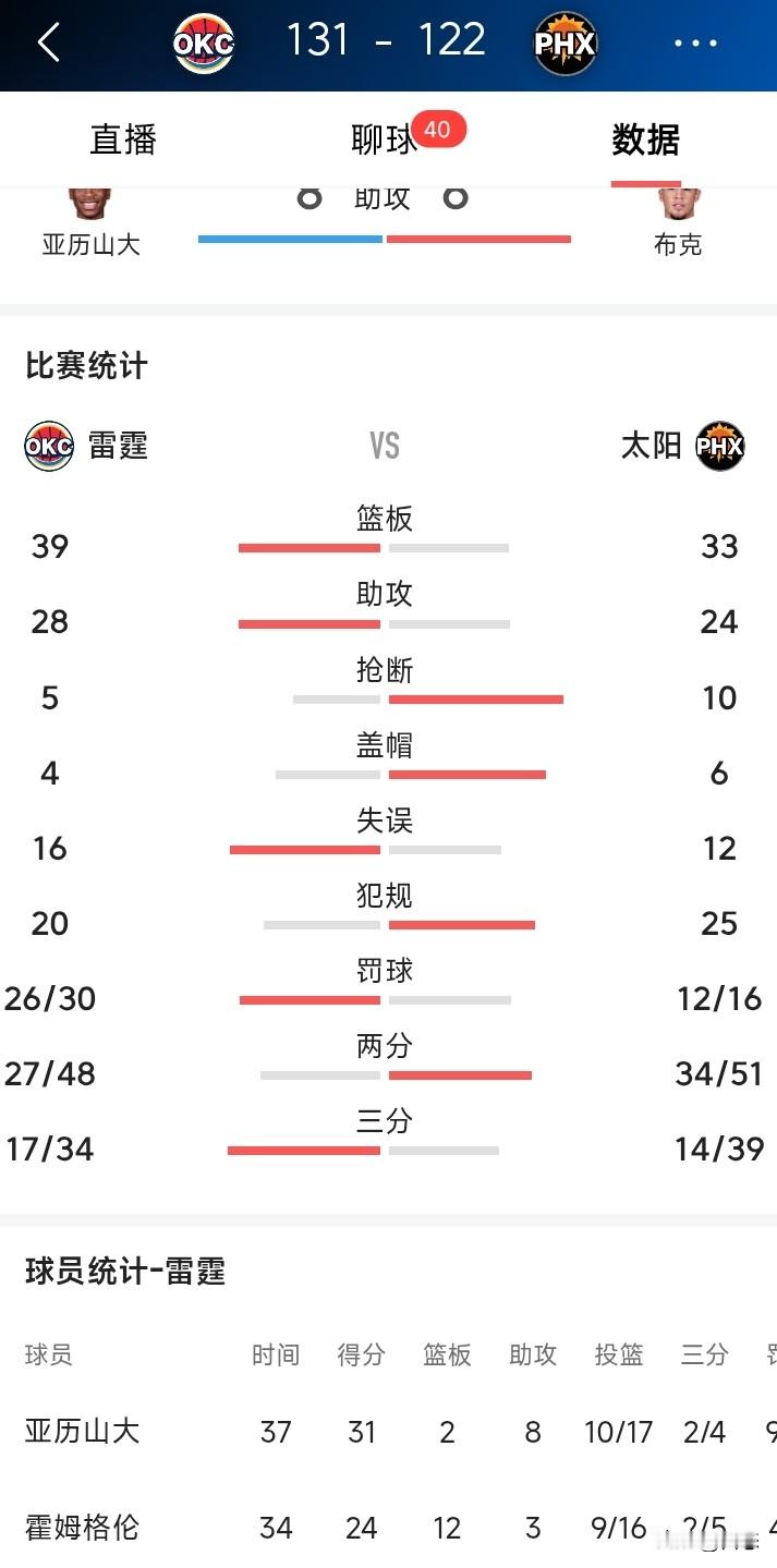 雷霆131比122太阳,太阳被横扫出局。看了比赛,太阳拿雷霆一点办法都没有,雷霆打球的人太多了。亚历山大命中率又高,气人的人罚球还不少,这是雷霆能赢球的关键。