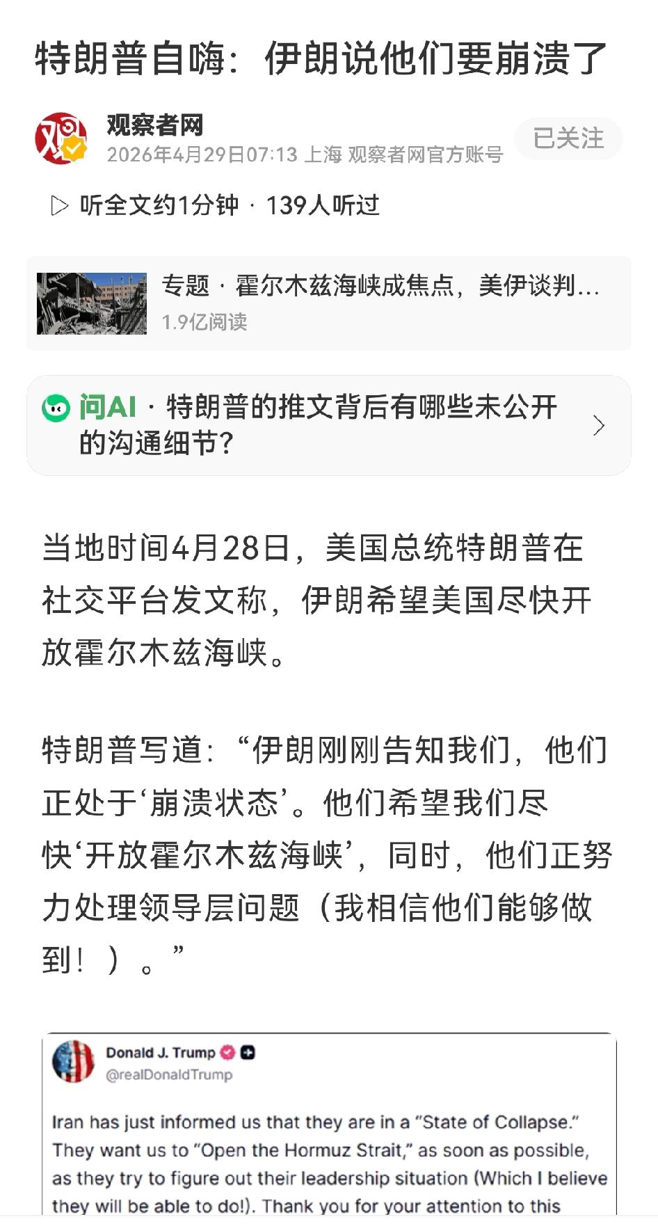 特朗普又在自嗨,说伊朗告知美方他们正处于"崩溃状态",希望美国尽快"开放霍尔木兹海峡",同时正努力处理领导层问题。特朗普未说明伊朗如何传达这一消息,路透社对此表示质疑。此前白宫曾证实,伊朗提出的是有条件重开海峡的谈判方案,要求美方先解除封锁并停火,特朗普团队27日刚讨论过该提议,且特朗普本人对方案表示不满。