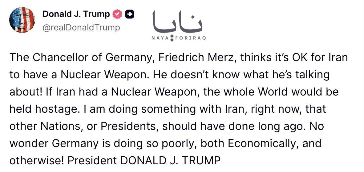 🔻特朗普抨击默茨:“德国总理弗里德里希·默茨认为伊朗拥有核武器是没问题的。他根