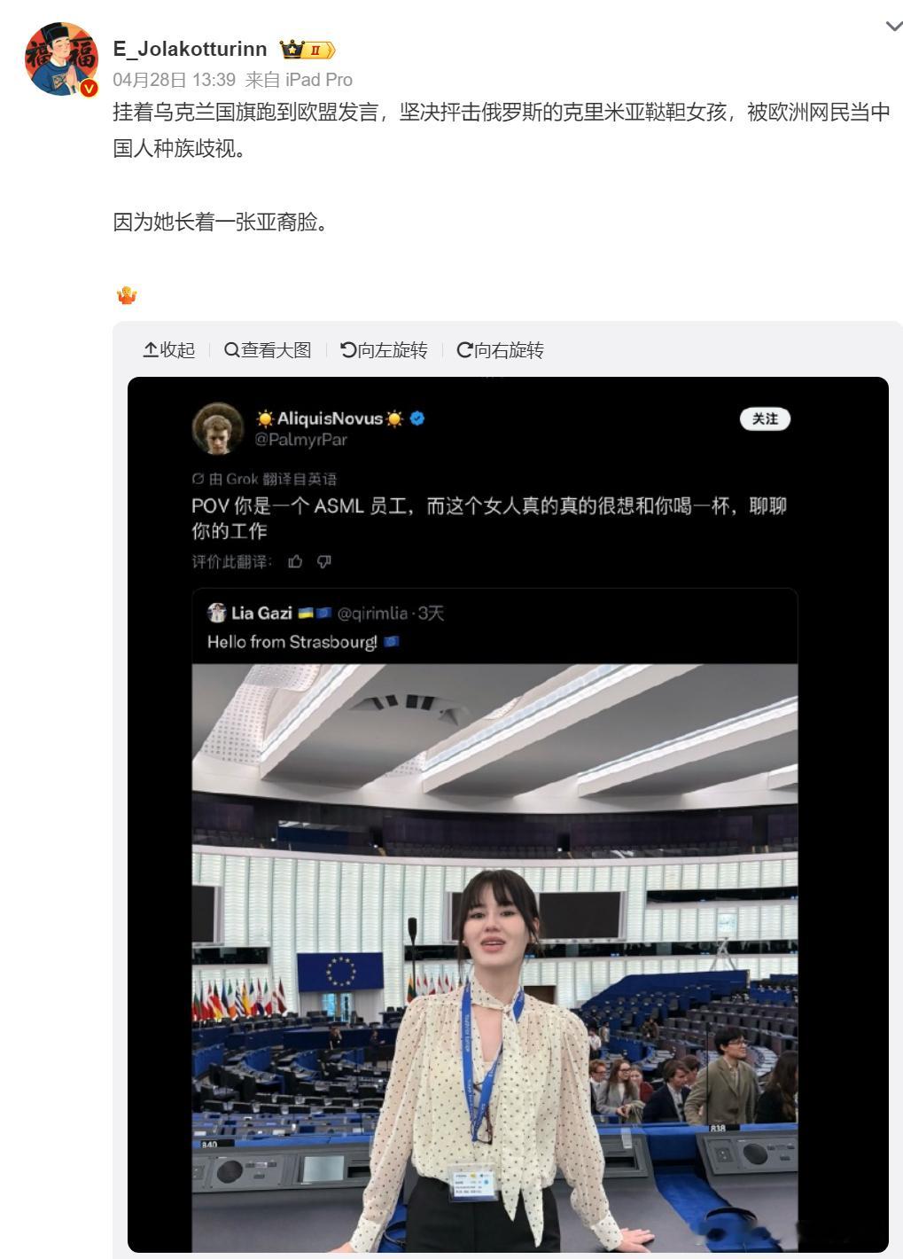 🔻网友分享:“乌克兰的克里米亚鞑靼骗子在欧盟招摇撞骗。然后欧洲白男说:东大间谍