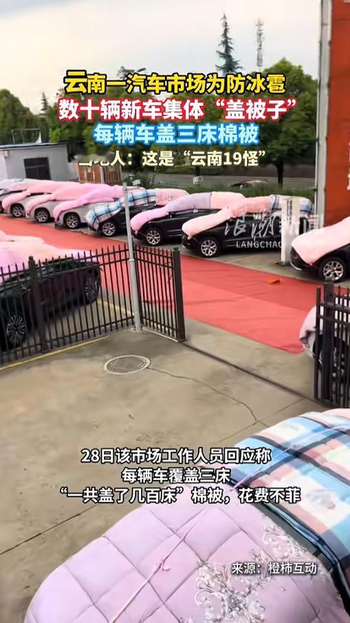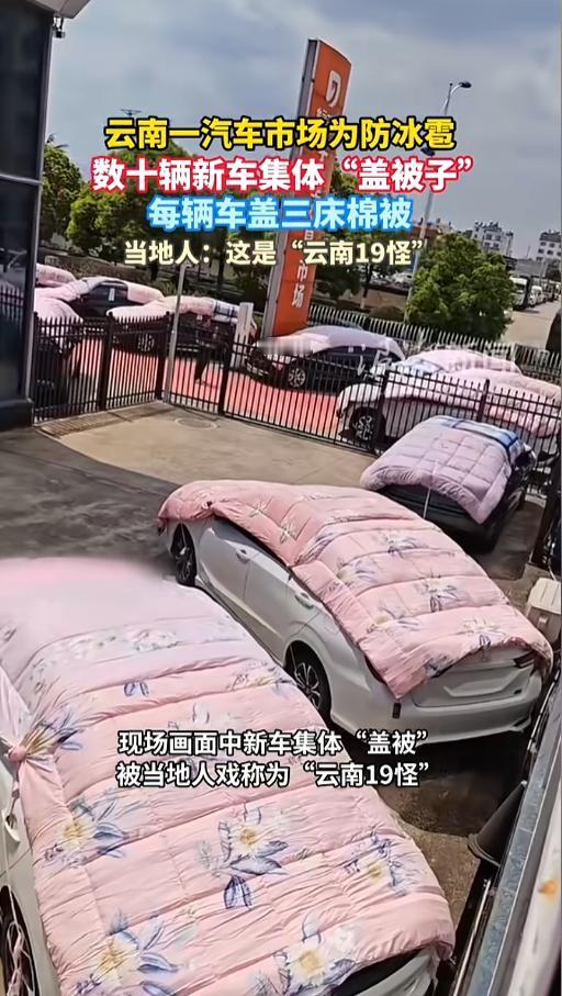 信息来源:《云南一汽车市场为防冰雹,数十辆新车集体“盖被子”,每辆车盖三床棉被,当地人:这是“云南19怪”》浪潮新闻