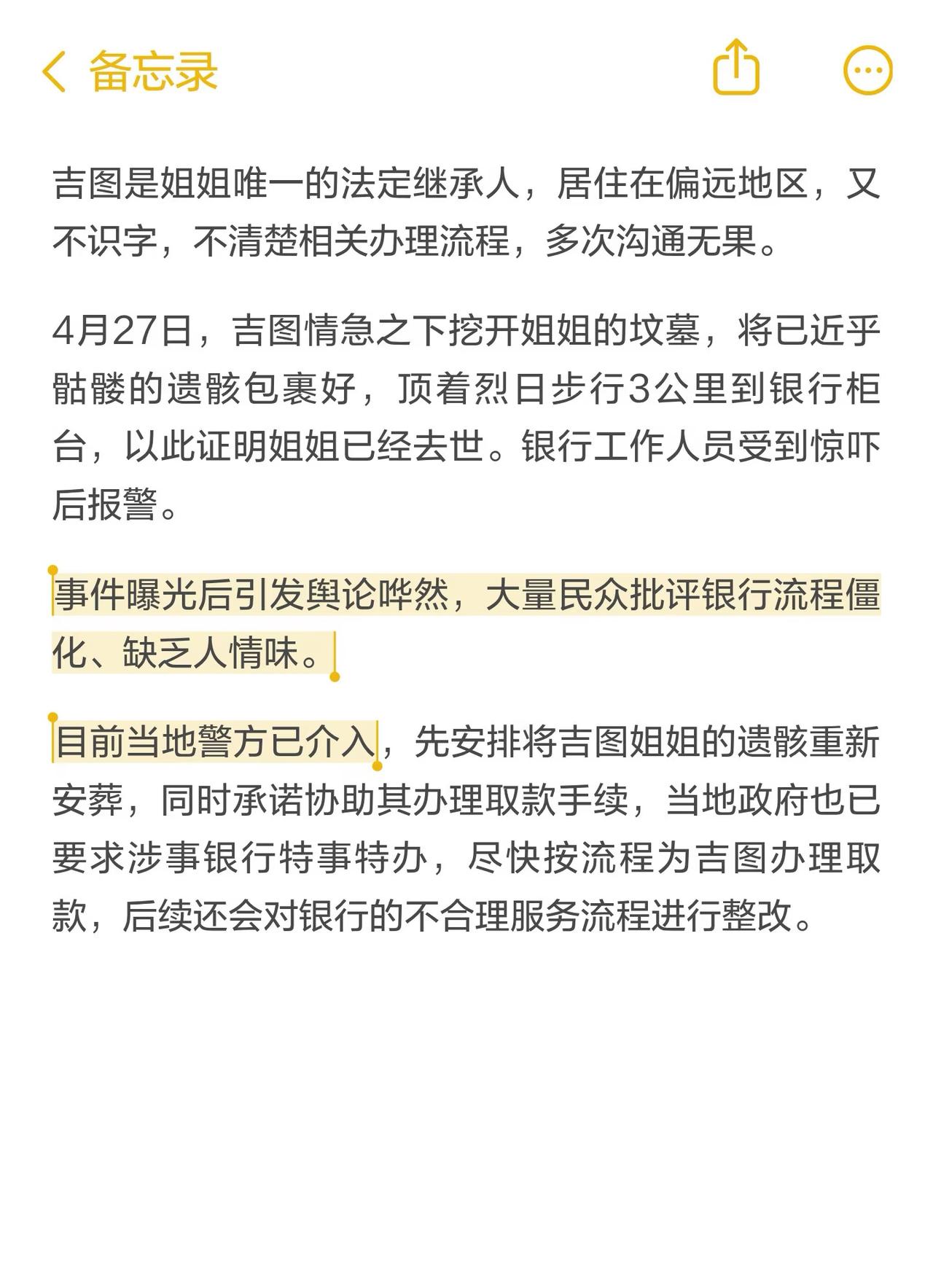 吉图最终通过极端方式证明姐姐去世,引发舆论哗然。警方已介入,银行承诺特事特办并整改流程。