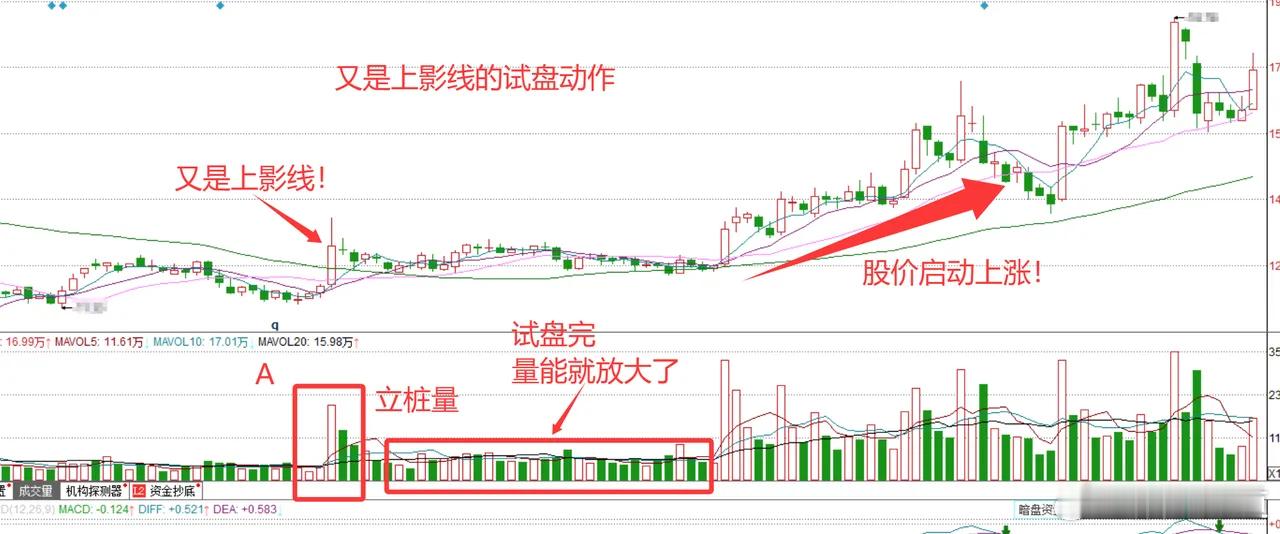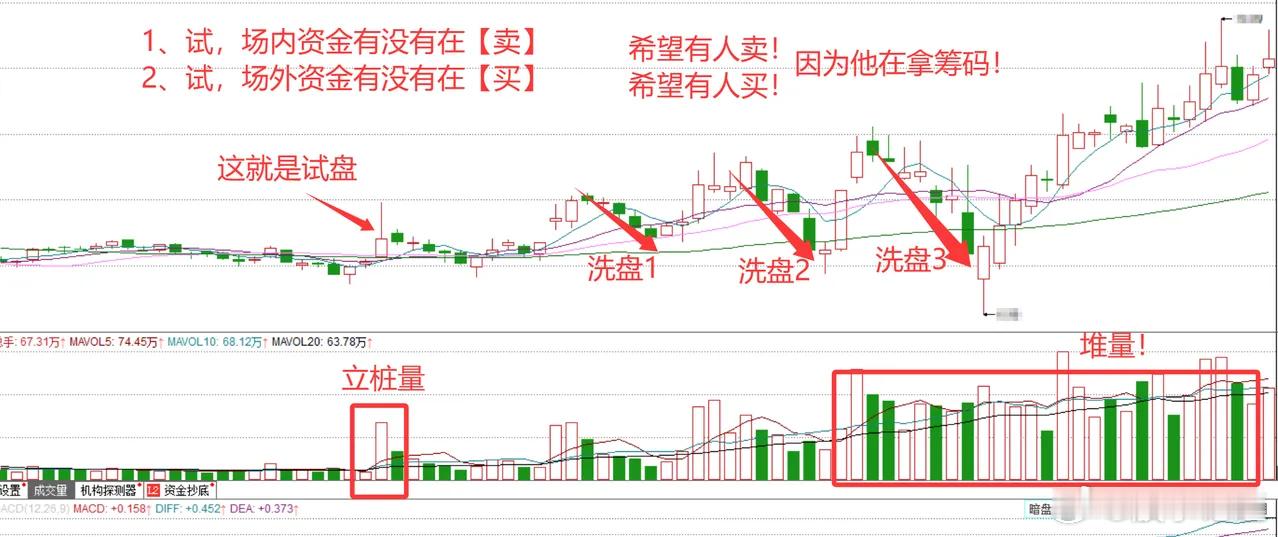 【直接上案例】大家来看图1,这个例子同时也是我们前几天讲堆量的时候用到的一个案例。我在图片左边的位置用箭头指出来的那一根长上影线的阳柱就是所谓的试盘。那么问题来了,主力试盘,它是在试什么呢?我直接揭晓答案,主要试的有两点:一就是前方“套牢盘”的卖出意愿是否强烈;二则是在拉高的股价的时候,场外资金的跟风盘表现如何。说简单点,就是在拉高股价的时候,试这个股票场内的资金卖不卖出、场外的资金买不买入。 【什么时候会出现试盘呢?】一只股票,你看到有资金在做试盘的动作的时候,你去往前看,往往就可以看到前方有或多或少的套牢盘。如图2,这个股票就是一个非常典型的案例。我给大家圈出来的试盘的那天,上影线的高点画一条横线,往前去找,就可以找到之前的一个前高,也就是我们所说的套牢盘。当股价在当日拉起来的时候,正好前方的套牢盘有机会解套了,那这些之前被套住的散户就会有卖出的欲望。 【试盘的结果是什么?】各位注意,如果一个股票的主力资金试盘的结果是:套牢盘不愿意卖出、并且场外的资金一呼百应,非常愿意追涨,那么这个时候就代表了可以进入下一步了。那么就是接下来不断的洗盘。大家继续看图1,紧接着跟在试盘线后面的,就是三轮洗盘。这段洗盘,主力资金会不断揉搓股价。等洗盘结束之后,主力的手里也获得了更多的低成本的筹码。等这一切都结束之后,就可以拉升股价了。 【再看一个案例】大家看,如图3所示:上影线之后,随即进行的就是一段时间的洗盘,在这个过程中,量能是放大的。虽然可能不显著,但是也算满足堆量的条件。随后当一段时间的洗盘结束,主力资金对于筹码的掌控已经比较充沛的时候,股价就开始启动上涨。实时热搜创作激励计划今日看盘股票