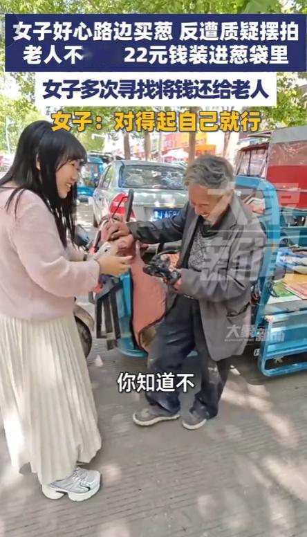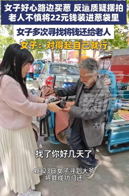 信息来源:大象新闻《4月23日,河南濮阳,女子好心路边买葱反遭质疑摆拍,老人不慎将22元钱装进葱袋里,女子多次寻找将钱还给老人,女子:对得起自己就行》