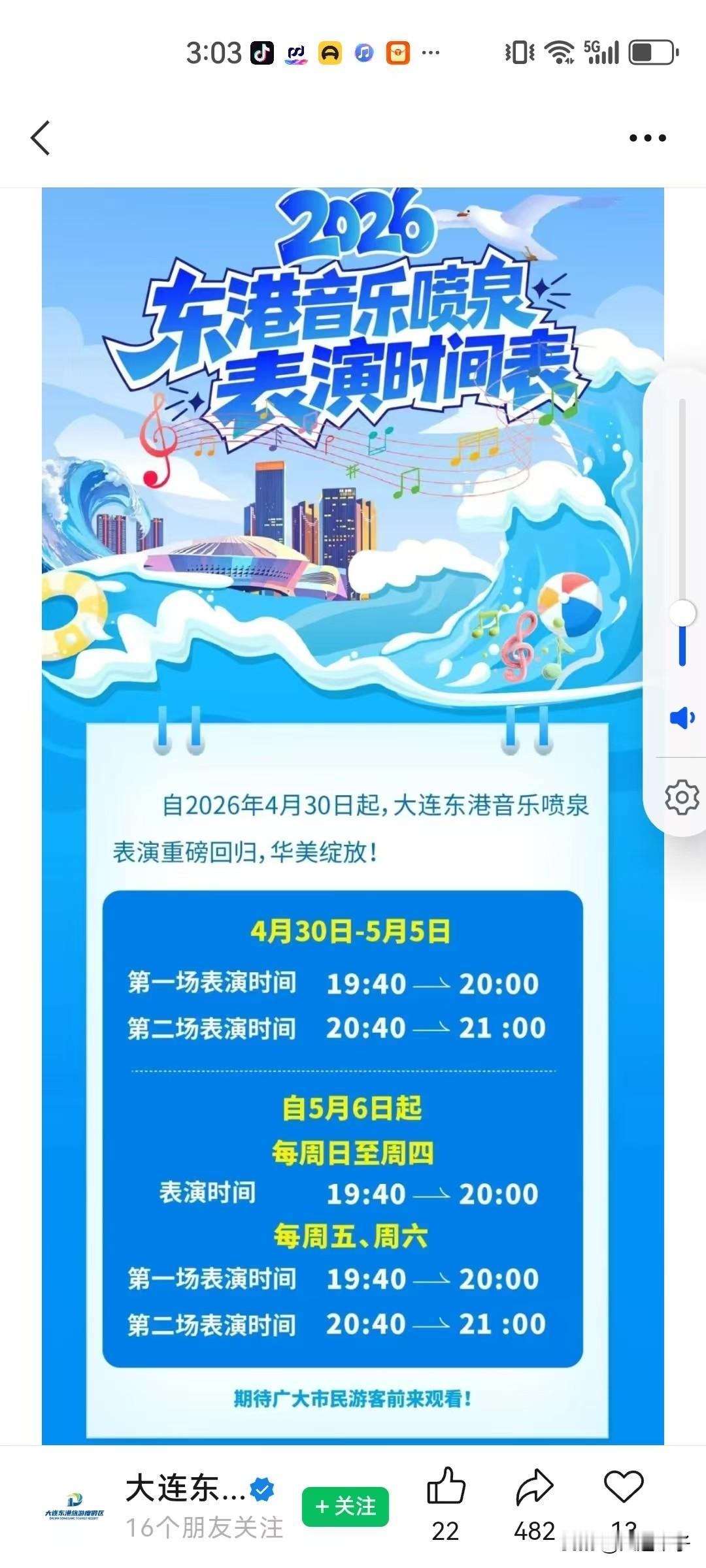 五一假期连续表演6天,大连东港音乐喷泉表演时间来喽!