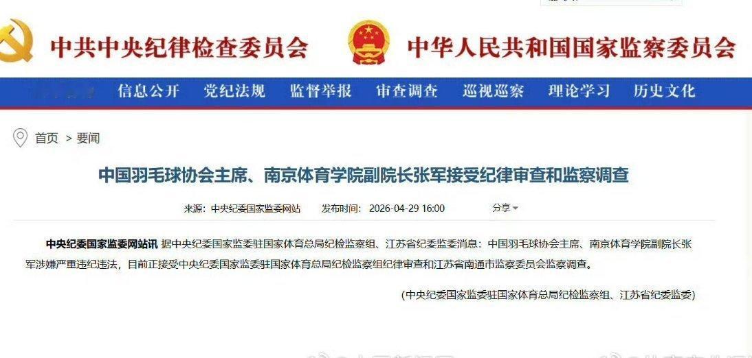 太突然了!今天官方发布通报:中国羽坛的传奇人物张军,竟然落马了!他的名字承载了太