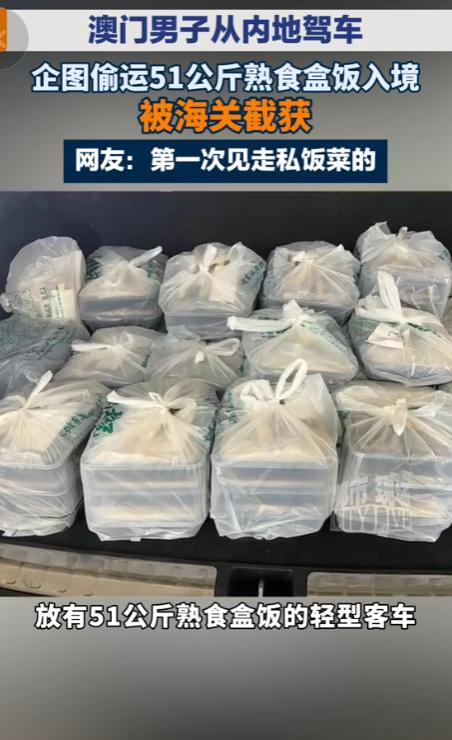 信息来源:都市现场《澳门男子从内地驾车企图偷运51公斤熟食盒饭入境,被海关截获。》