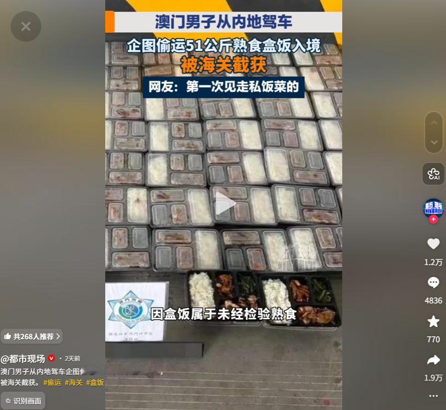而此次涉案的51公斤盒饭,远超个人自用限额,且存在转售牟利意图,已不属于单纯的“带饭”,而是明确的偷运行为。