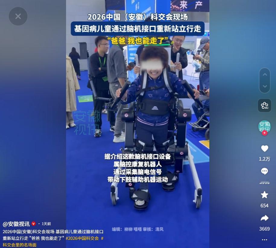 信息来源:安徽视讯《2026中国(安徽)科交会现场 基因病儿童通过脑机接口重新站立行走 "爸爸 我也能走了"》