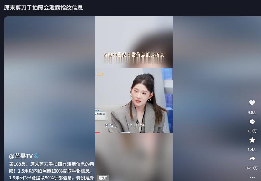 信息来源:芒果TV《原来剪刀手拍照有泄漏信息的风险!1.5米以内拍照能100%提取手部信息,1.5米到3米能提取50%手部信息,特别是外人让自己预留指纹信息一定要拒绝》