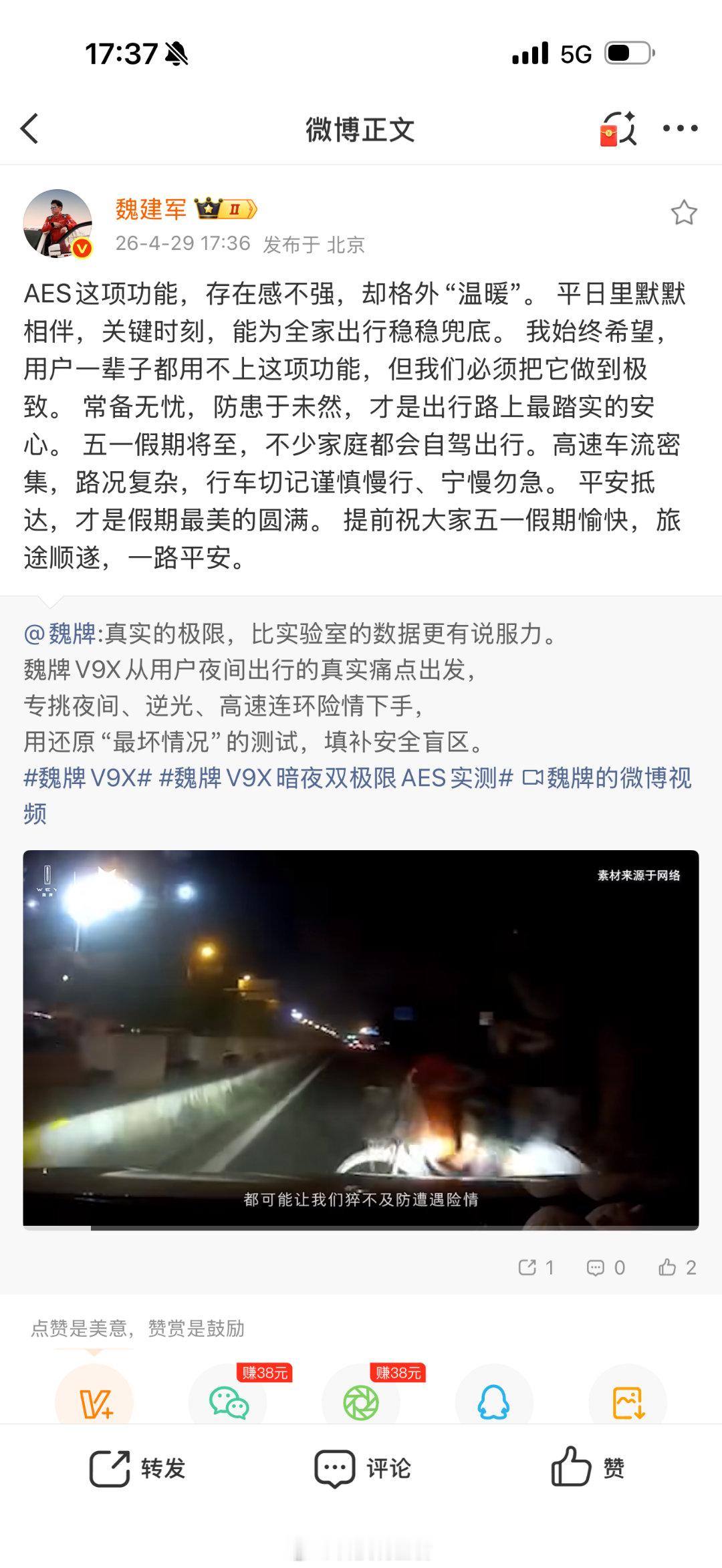 安全配置这东西,平时可能用不上,但关键时候能保命。魏牌的理念我很认同——不搞花哨噱头,把成本花在真正能兜住安全底线的技术上。“内见风骨,形不张扬”,家人坐得安心,比什么都重要。魏牌V9X暗夜双极限AES实测