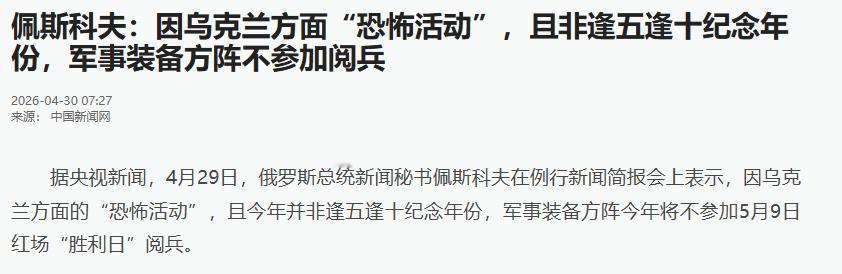 俄罗斯总统新闻秘书佩斯科夫在4月29日的例行记者会上承认,今年阅兵不展示军事装备,原因有两个:一是乌克兰方面的“恐怖活动”,二是今年不是逢五逢十的纪念年份。这个解释听起来冠冕堂皇,但仔细一琢磨就漏洞百出。