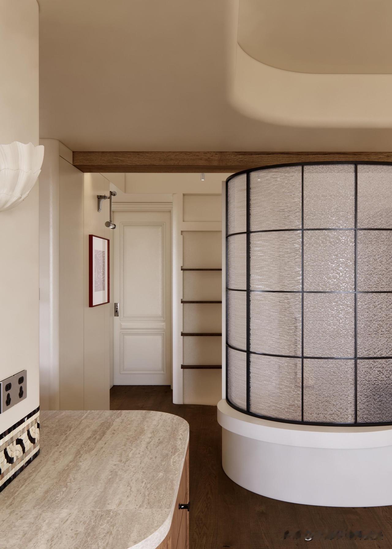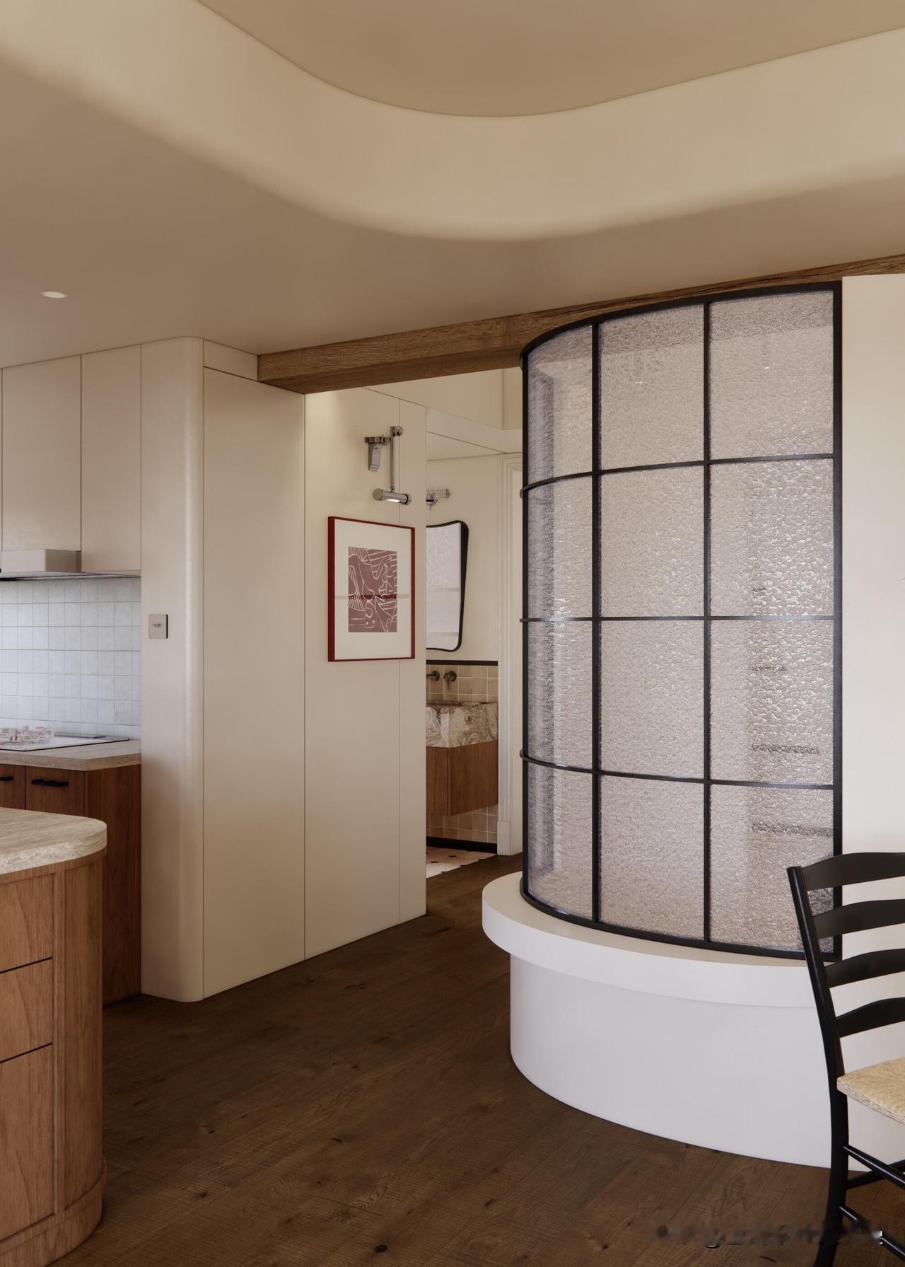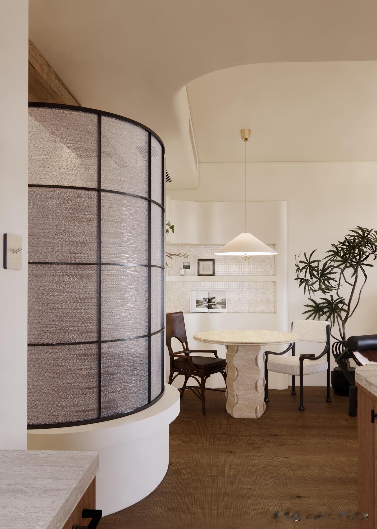 ▫️弧形水波纹玻璃隔断:半透朦胧质感,分隔空间不挡采光