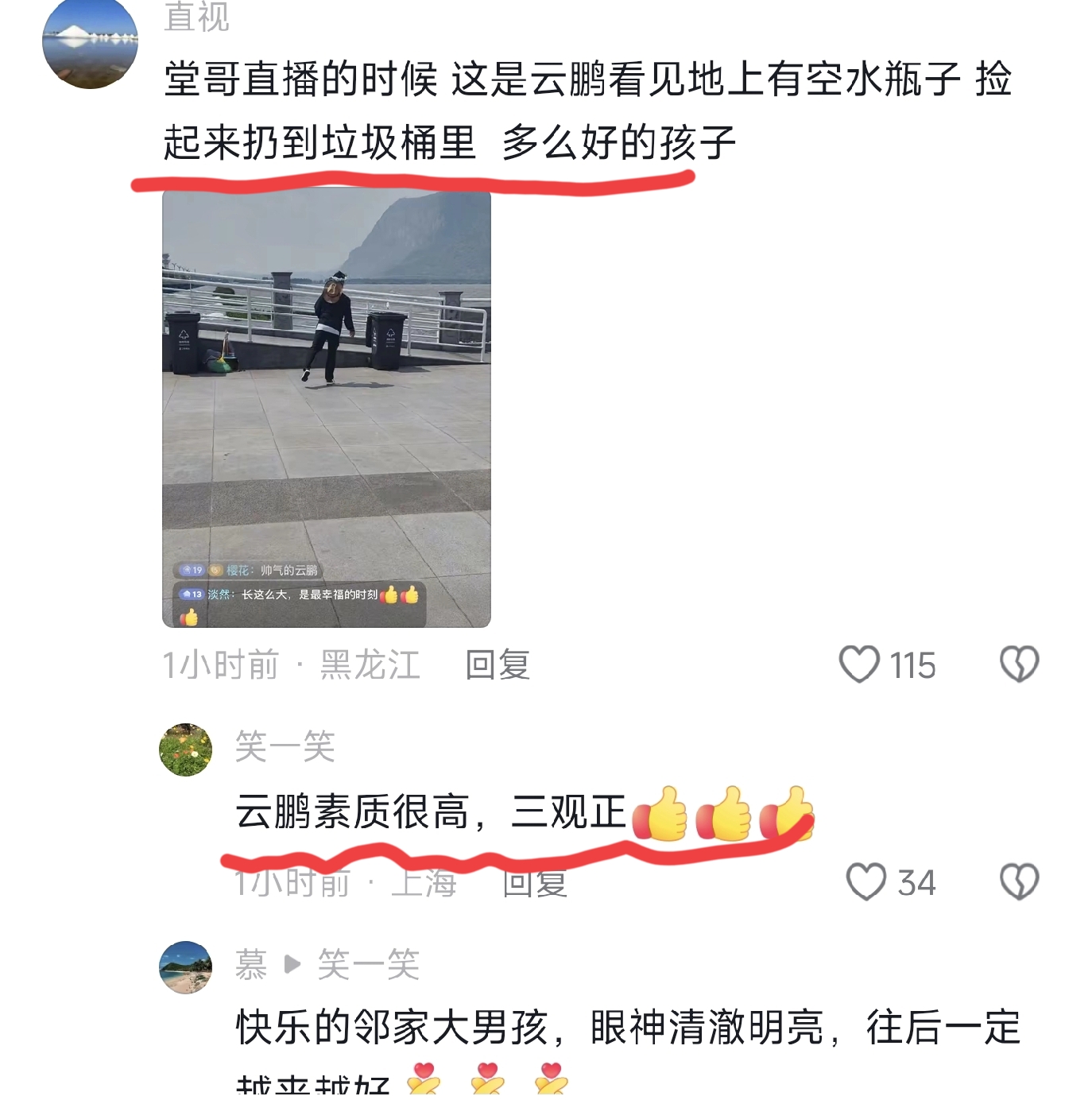 昨天张云鹏堂哥直播时,张云鹏1个小小的举动被网友猛夸,云鹏堂哥带云鹏出去玩的时候他在直播的过程中,张云鹏看到路上有塑料瓶,张云鹏立马捡起来扔进了垃圾桶,整个过程可以看出来没有刻意很自然