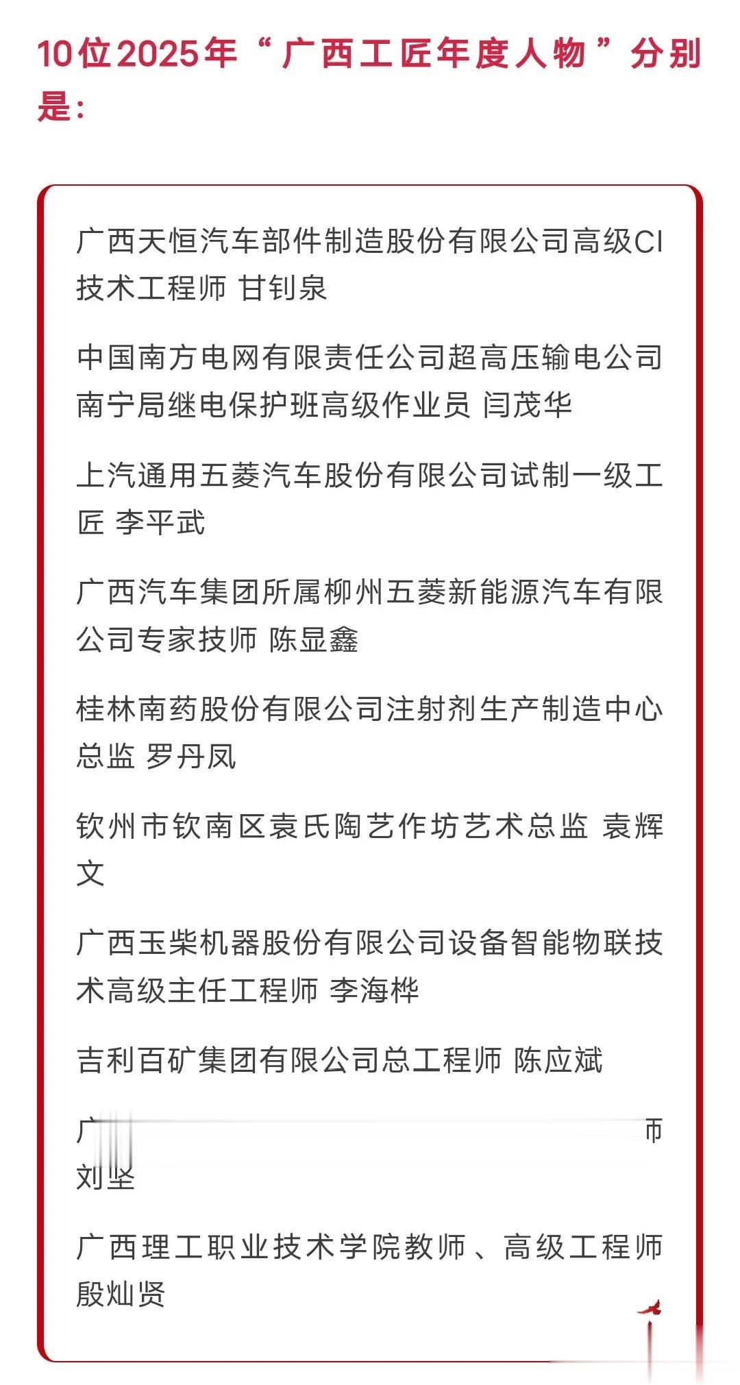 4月8日,由广西壮族自治区总工会、工业和信息化厅、科学技术厅、人力资源社会保障厅主办的2025年“广西工匠年度人物”发布活动在南宁盛大举行。活动现场揭晓了10名“广西工匠年度人物”,他们来自不同的行业,但都以卓越的技能和不懈的匠心精神,为广西的经济发展和社会进步作出了突出贡献。