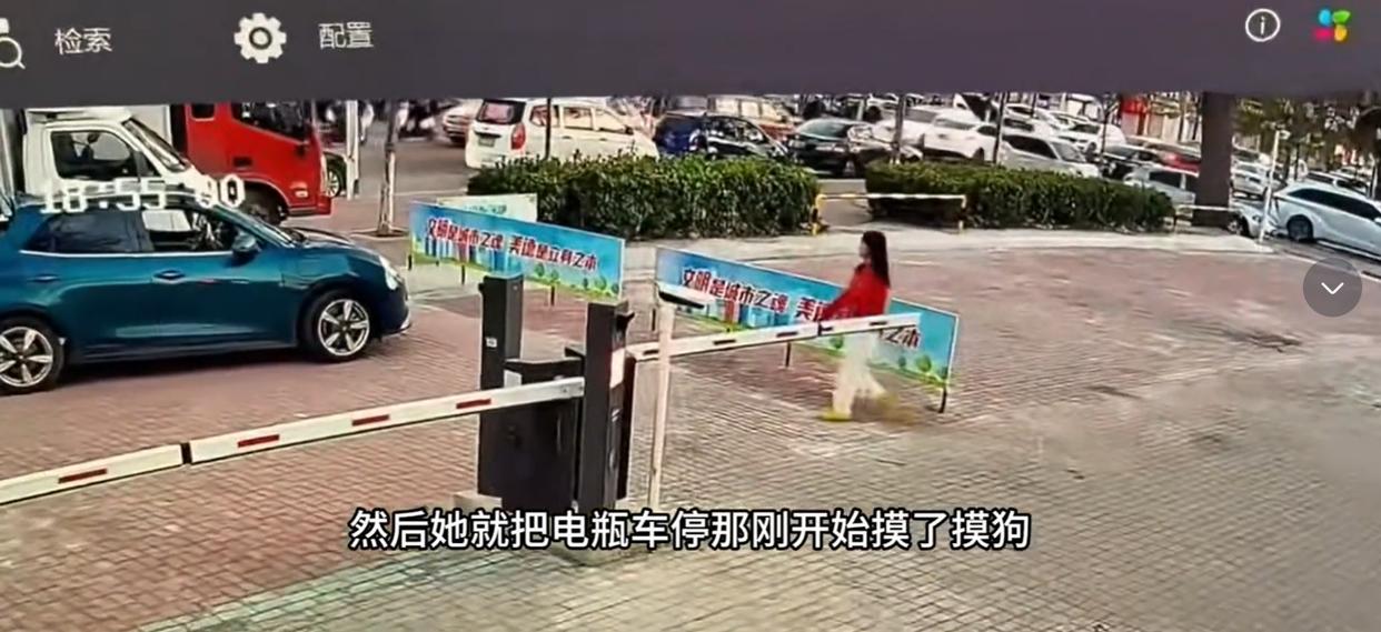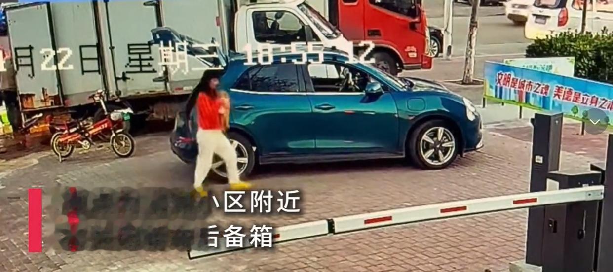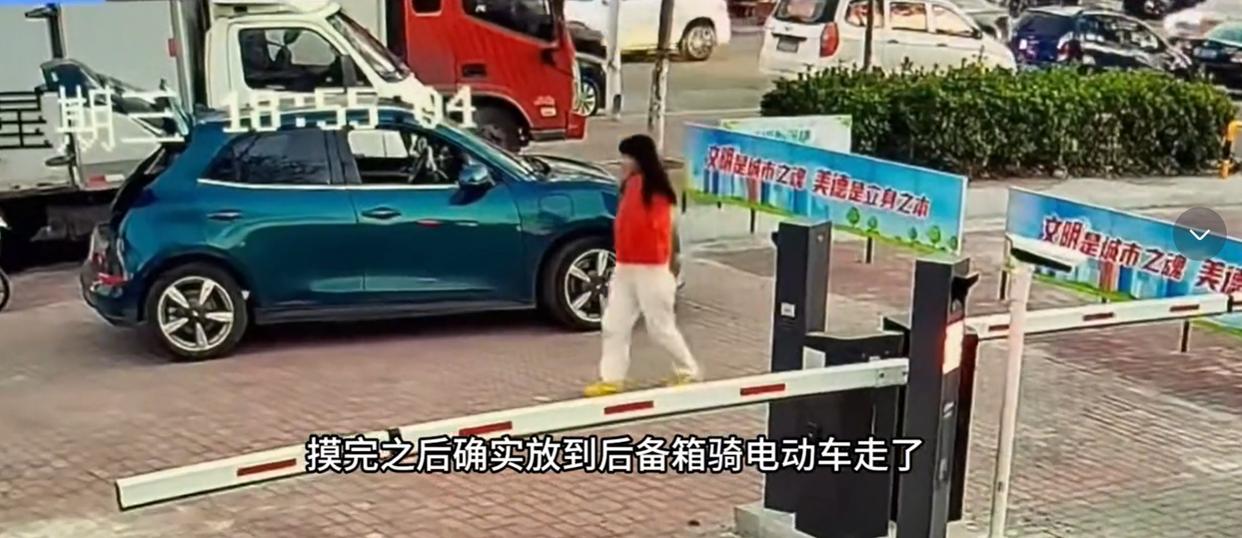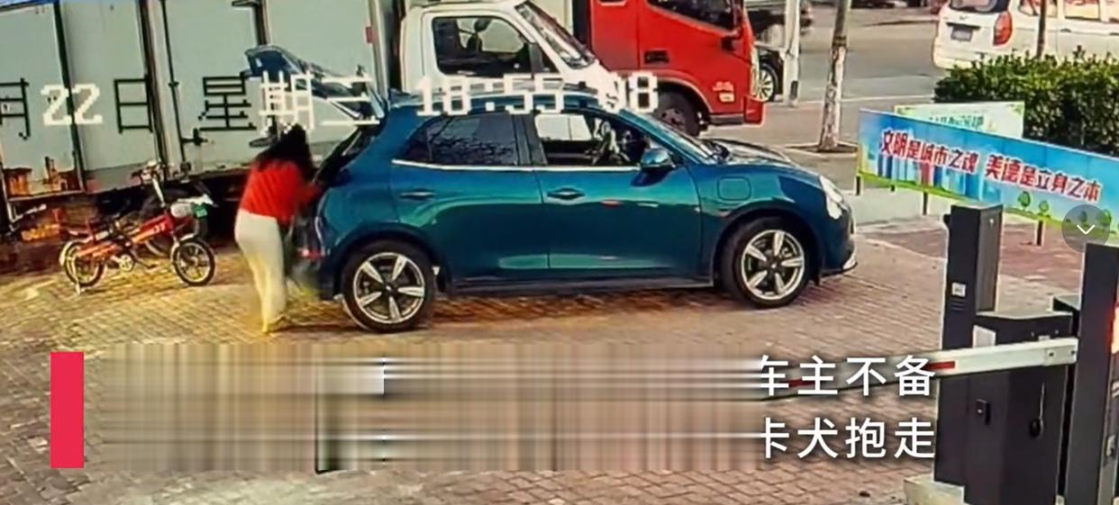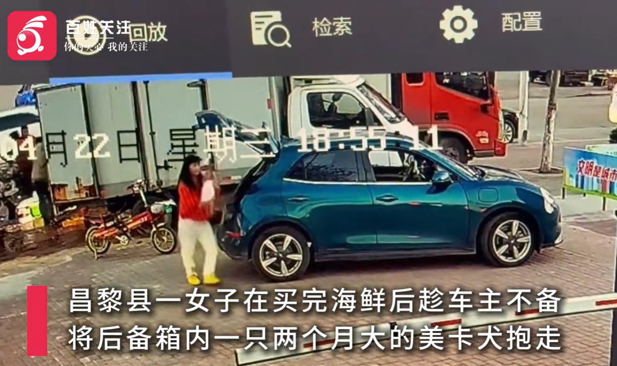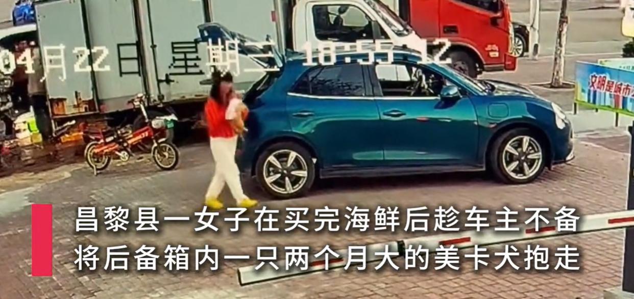 监控清晰地记录着,女子没有付款,便来到后备箱。女子先是逗了狗狗一分钟左右,随后双手一伸,把狗狗从后备箱抱出来,若无其事地抱着狗狗来到她电动车旁,随后骑着电动车离开。