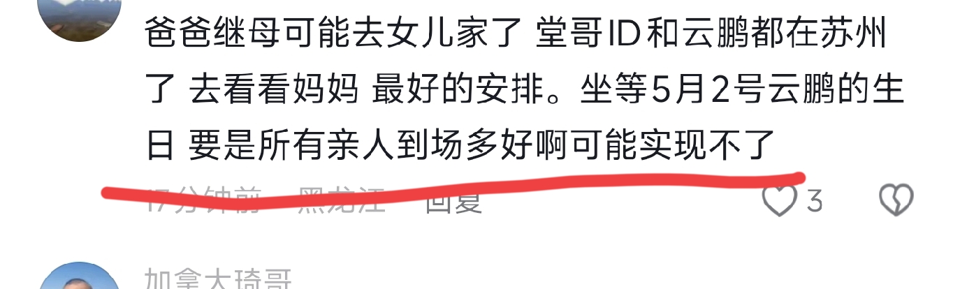 目前云鹏爸爸的账号ip还是显示在浙江应该他没有去,还有网友猜测云鹏爸爸和云鹏继母应该去继母女儿家了,堂哥和云鹏一块去苏州看妈妈了