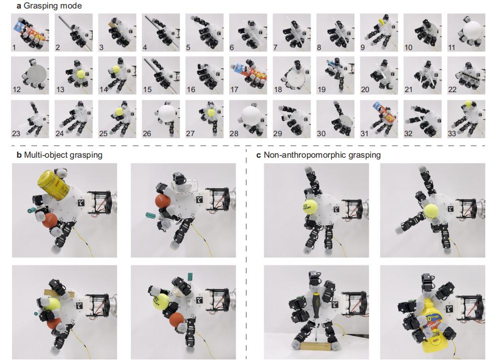 它能够完成人类手部 33 种标准抓取模式中的全部,可以稳稳地抓起重达 2 公斤的物体。在一组多物体抓取实验中,它一次性同时抓起了四个物体,这在传统机械手中非常罕见。它还能实现非拟人形抓取,使用任意两根手指组合完成精细的指尖捏合,甚至能够使用六根手指的版本完成单手拧瓶盖的动作。