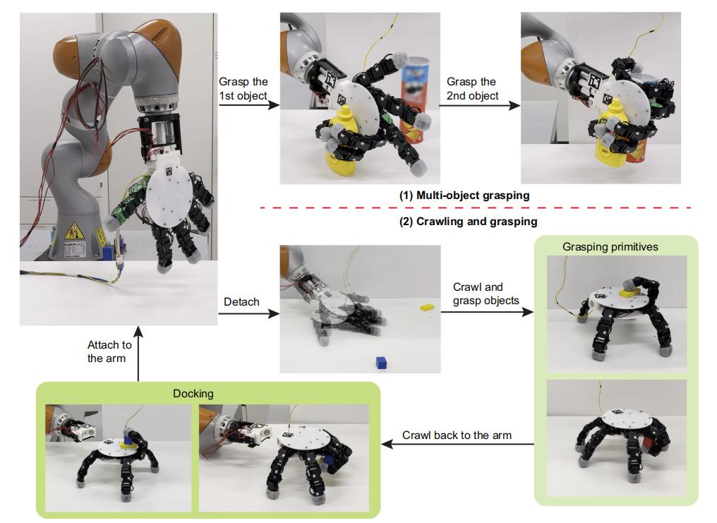 他们设计了一种可拆卸的爬行机械手,既能像普通机械手一样抓取物体,又能从手臂上脱落,进而变成一只五条腿或六条腿的爬行机器人,自己去够那些原本够不到的东西。